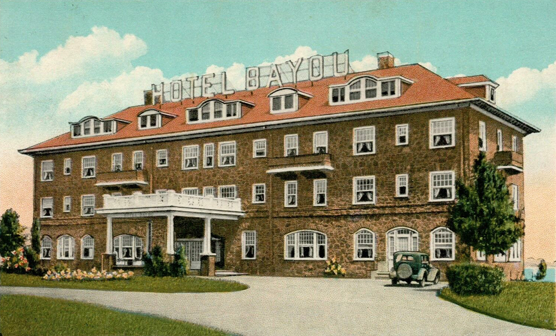 The indoor swimming pool (called the “Hotel Bayou Baths”) and heating plant were constructed off the premises of the hotel but nearby in what is now known as the Decoy Museum. It is shown on the 1930 Sanborn Insurance Map. The hotel also had an 18-Hole Miniature Golf Course at 300 Giles Street for use by the hotel guests between 10 a.m. and midnight. Also shown on the 1930 Sanborn Insurance Map, the golf course may have closed in 1934 with the demise of the hotel. In 1972 two apartment buildings with 12 units each were built on the miniature golf course property, now known as 300 Giles Street.