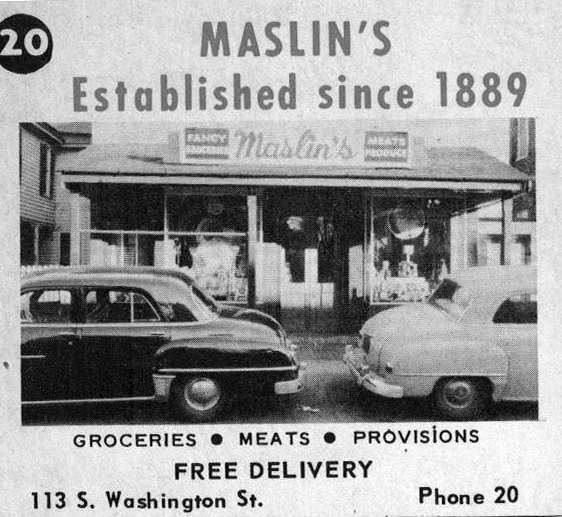 Frank S. Maslin’s son, John Carville Maslin, joined his father in the business in 1913. Upon the early death of Frank Maslin in 1914, John Carville Maslin (as only a teenager) took over managing the store. After marrying his wife, Ella, they managed the store until 1970, when the family sold the property. He was assisted in the store by his sister, B. Gladys Maslin. The store enjoyed a good reputation for high quality meats and provisions and was a “Certified Esskay Meat Dealer.” Hilda Parsons used to walk by the store going to elementary school and see turkeys, chickens, and “cow parts” hanging outside. And local businessman, Cecil Hill, remembers working for John Carville Maslin, who drove a black 1949 Dodge, in the store in the 1950s.