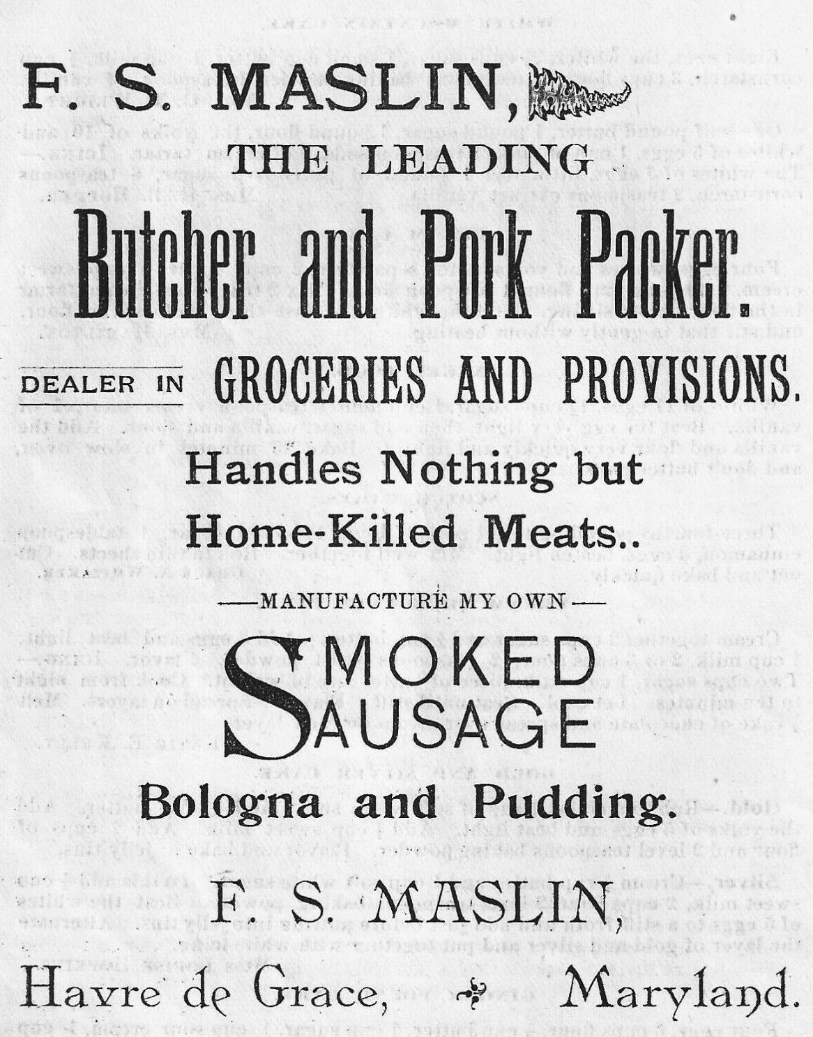 The meats, groceries and provisions store of Frank S. Maslin, Sr. (1868-1914) opened here in 1889. The building is alleged to have been the oldest in Havre de Grace and the one in which Admiral Cockburn, the British Naval Officer who attacked Havre de Grace in May 1813, is said to have frightened the residents of the house so that they fled leaving their dinner, which the Admiral and his officers ate.