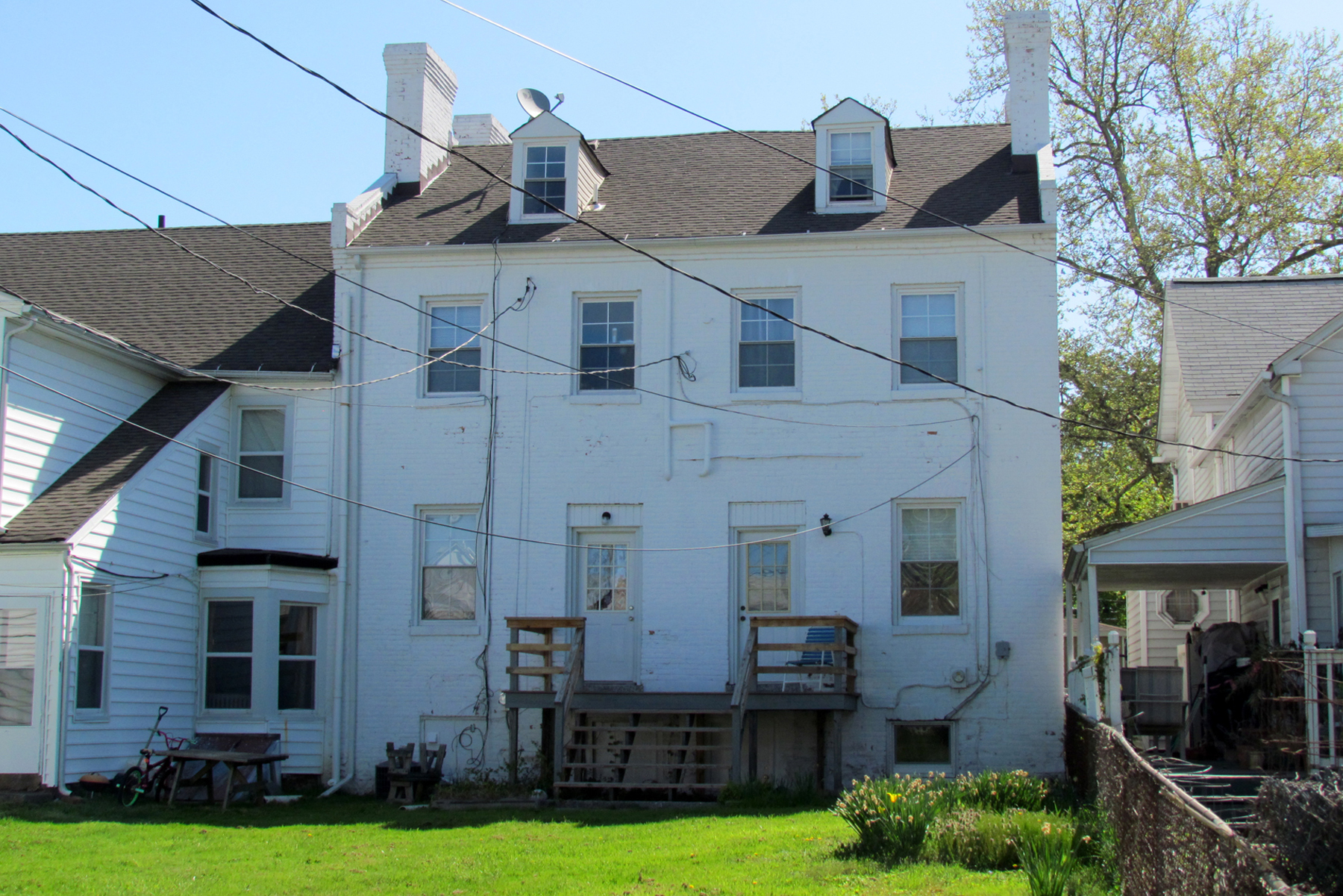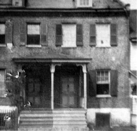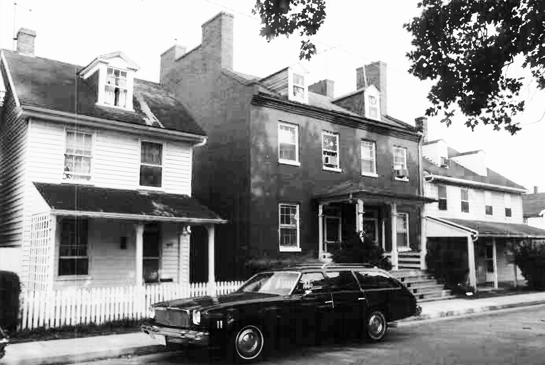The land on which this federal townhouse was built was owned by Mark Pringle (1761-1819) from whose estate John Mitchell bought it in 1839. Pringle had owned large amounts of land in the area and it was to Pringle’s house on the outskirts of town that some residents retreated for protection during the War of 1812 as the town burned. A photo exists showing the south side of this building with the old railroad station in the background at a time when the roads were surfaced with oyster shells. The Maryland Historical Trust estimates that the house was built c. 1840. This would mean that John Mitchell (1799-1891) and M. Eliza Mitchell (1812-1881) would have built it prior to selling the property to Samuel West and John Vannort in 1841. The house is thought to have always been a double house, but for many years both sides were owned by the same person.