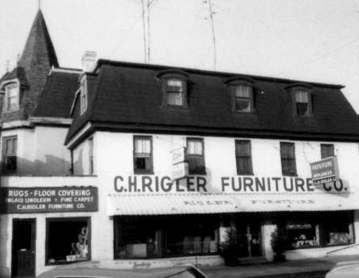 In the late 1950s, Carlton H. Rigler, Sr. (1921-1999) opened the C.H. Rigler Furniture Store here and sold furniture, appliances, televisions, and floor coverings, sometimes with help from his wife, Nettie. They also rented apartments in the building, and for a short time Miles Thorpy operated a pool room in the basement. Unfortunately, in 1976 a huge fire demolished the entire building and injured one firefighter. Following the fire, a courtyard complex of small stores was constructed with a flagpole in the shape of a ship’s mast decorated with some nautical flags.