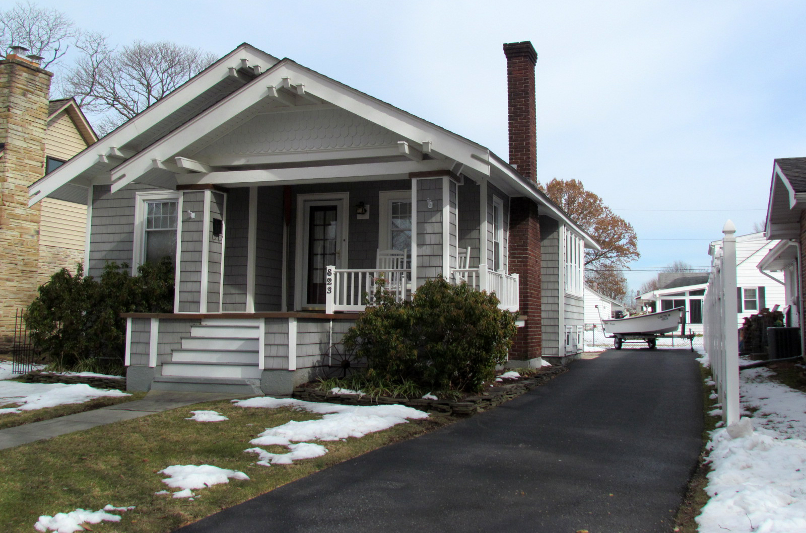 This craftsman-style bungalow is believed to have been a Sears Roebuck Model Kit Home named the “Argyle.” It is assumed that the Kellys ordered the kit and had it built. Several Sears kit homes were built in Havre de Grace in the early 1900s, and the town being on a railroad proved convenient for shipping. A standard Sears Home Kit contained around 25 tons of materials, more than 30,000 parts, 750 lbs of nails, along with a 75-page instruction book that were shipped directly to the purchaser. The 370 different designs were only offered in Sears mail order catalogs between 1908 and 1940. Sears houses built after 1916 have stamped lumber elements that could be found in attics or basements. Pictures of some models are listed online at: http://arts-crafts.com/archive/sears/, but many homes have since been modified. The exterior appearance of this home, however, remains quite true to the model.