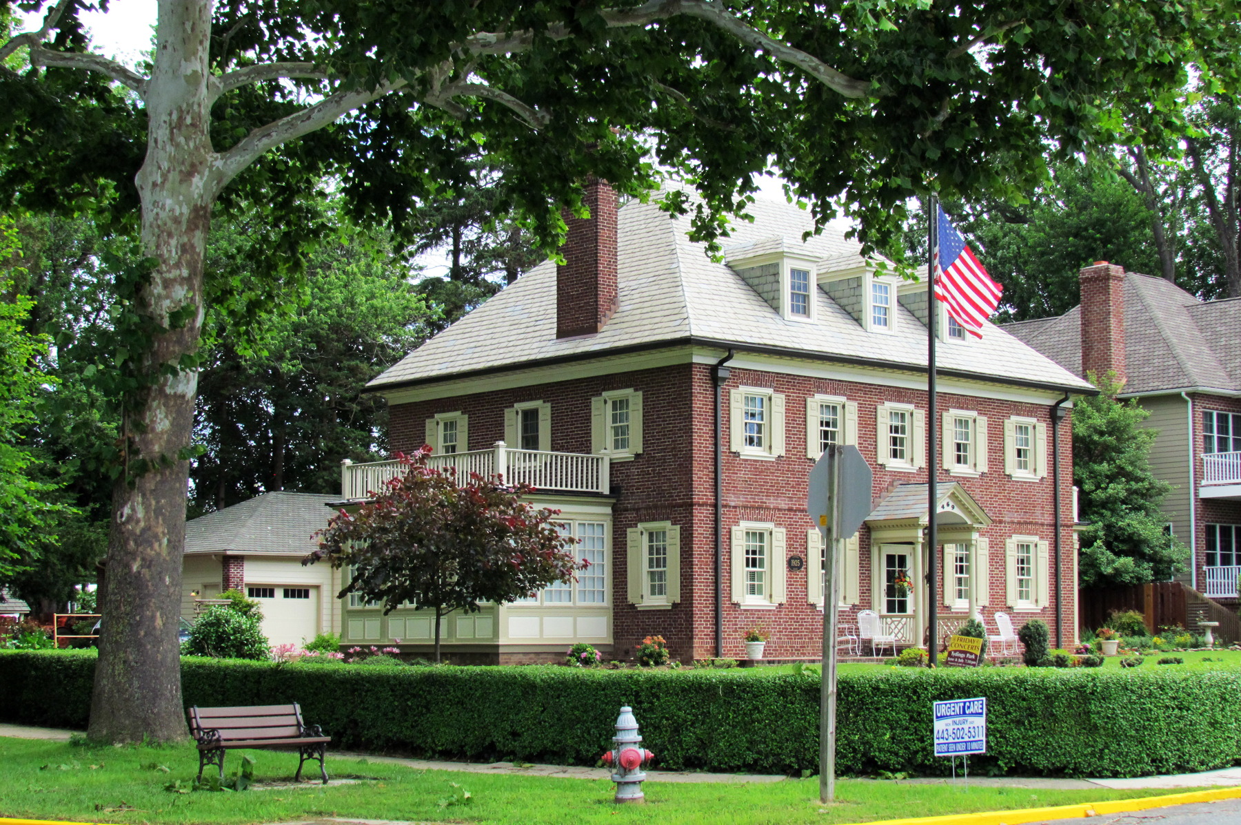This large and stately Georgian house is directly across Commerce Street from Tydings Park and the City Marina at the southeast corner of Union Avenue and Commerce Street. It used to sit on a much larger parcel of land (Lots 494, 500, and 506 in Square 259). In 1919, attorney Michael H. Fahey (1865-1940) and his wife, Mary Fahey (1868-1939), held the mortgage for this unimproved rectangular lot that extended from the southeast corner of Union Avenue to Lodge Lane, north to Giles Street, west to Union Avenue, and south again to Commerce Street. There were “annual pitched and cultivated crops” on all of these lots.