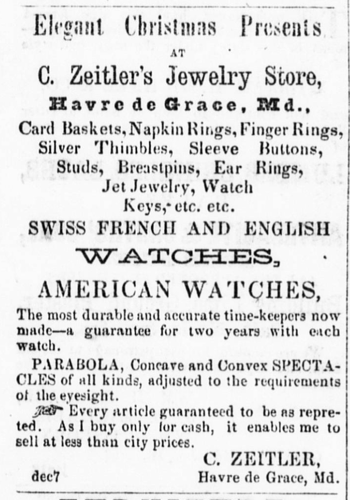 Charles Zeitler advertised that he sold wedding gifts and “clocks, watches, rich jewelry, and American watches.” He served on the City Council for a couple of terms in the late 1890s and in 1900 Charles Zeitler sold this property and business to George Warren Hughes (1868-1940) and moved to Baltimore.