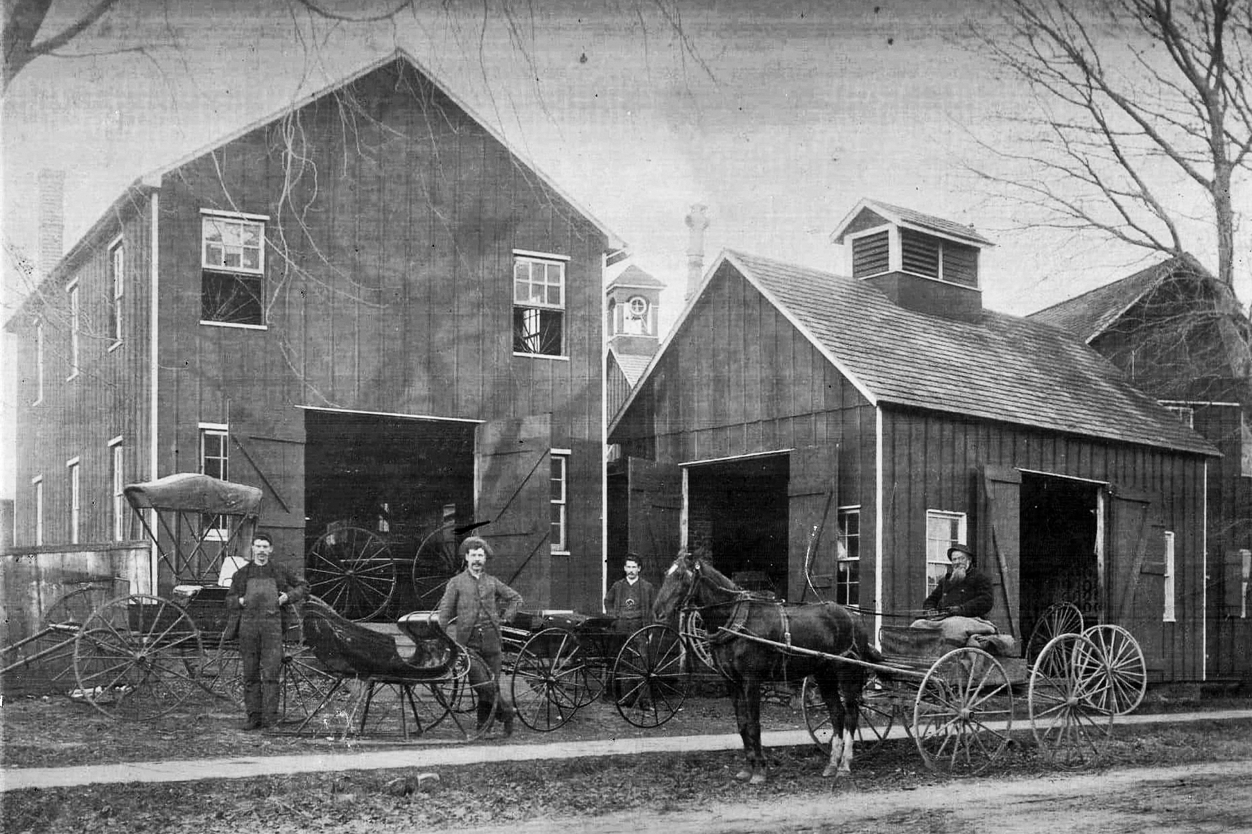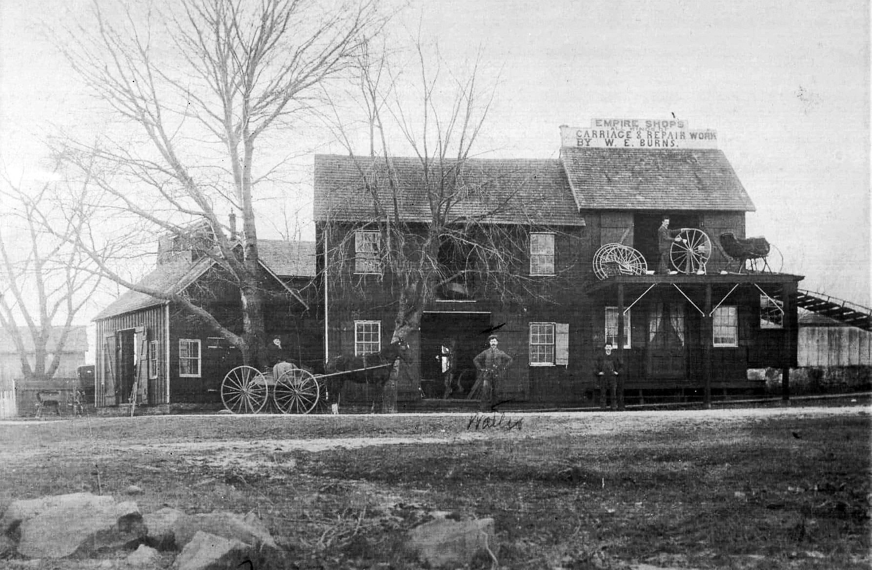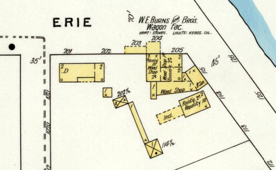 This corner of Erie and Water Streets was the location of the “Empire Shops, Carriage and Repair Works” opened by Walter Ellsworth Burns (1865-1943) in the late 1800s. Burns was Walter Elsworth Burns (1865-1943), who with his brothers formed the Burns Brothers Carriage Company. His brothers were Jonathan Isaac (1868-1942); Reese Norris (1870-1946), Alfred G. (1872-1965), and Charles Brittingham “C.B.” Burns (1879-1968). As can be seen on the Sanborn Insurance Map extract, their business straddled this corner of Erie and Water Streets. The Burns Brothers created the “New Little Beauty Wagon” in the late 1800s for rural carriers and the factory is credited with building the first US mail wagon and the local fire company’s hand- and horse-drawn vehicles. An 1880 carriage, the “Stanhope Trap” model, built by the Burns Brothers, can be seen today in the Marvel Museum in Georgetown, Delaware.