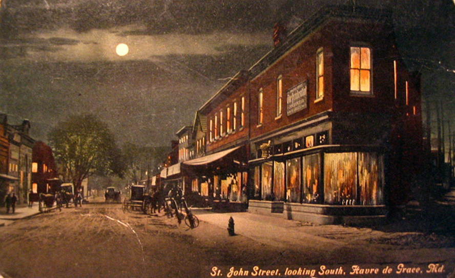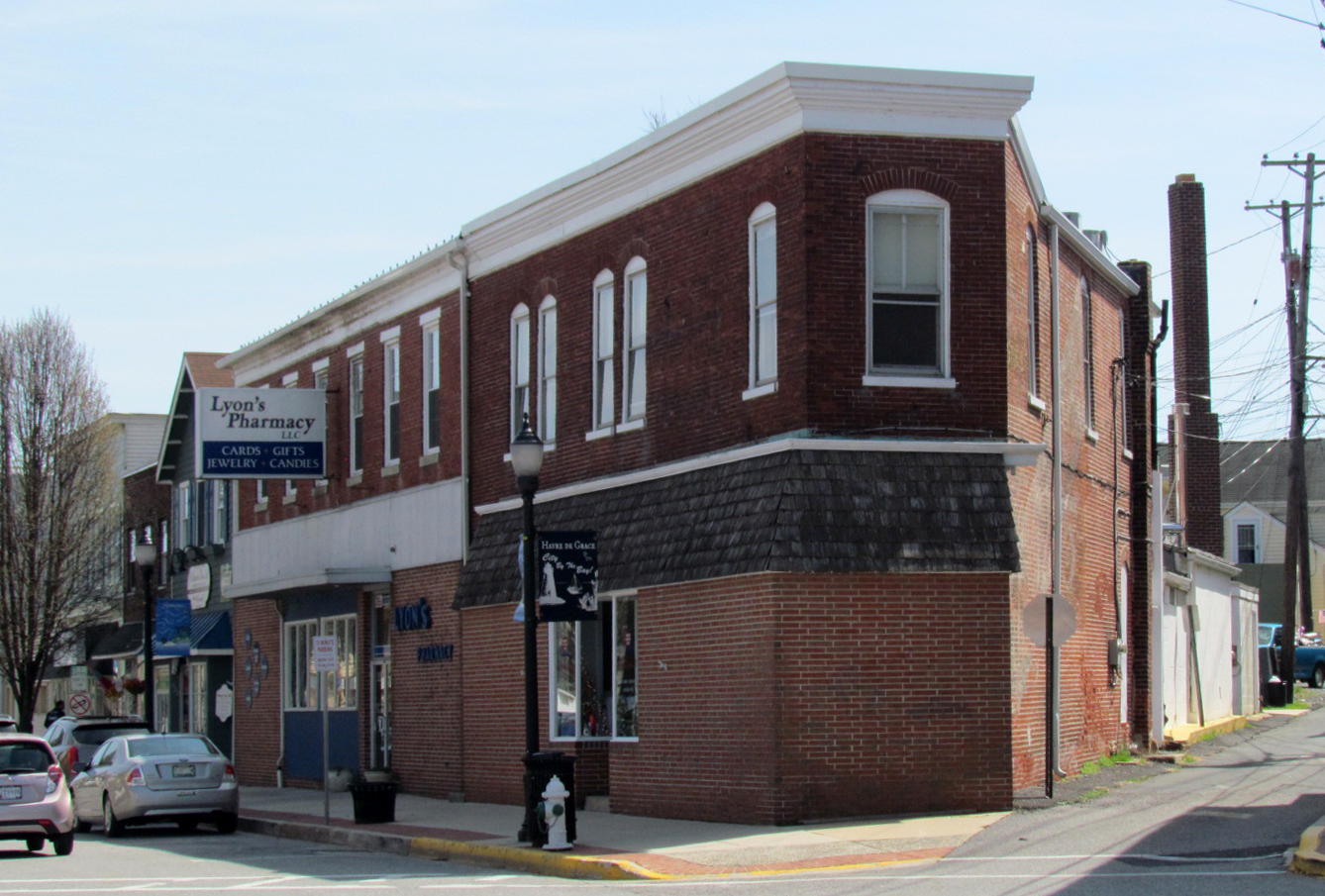 Established in 1894 by Andrew Lincoln Lyon, Lyon’s Pharmacy began in this triangular-shaped building and is one of Havre de Grace’s oldest businesses. In March 1899, robbers broke the glass in one of the front doors and ran off with 1,000 cigars—500 of them were found hidden under a house in the vicinity. The Era Druggists Directory, 1913 Edition,