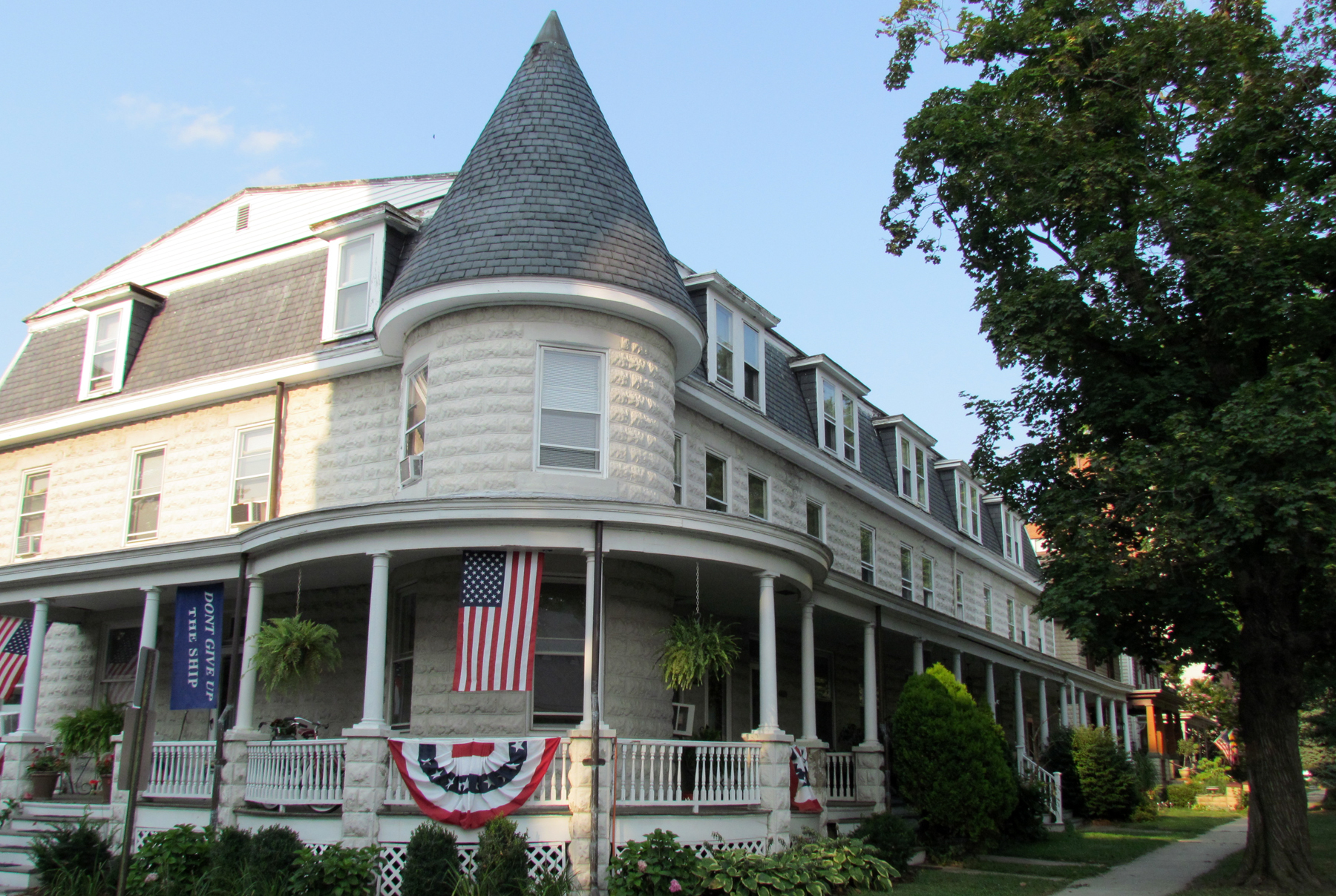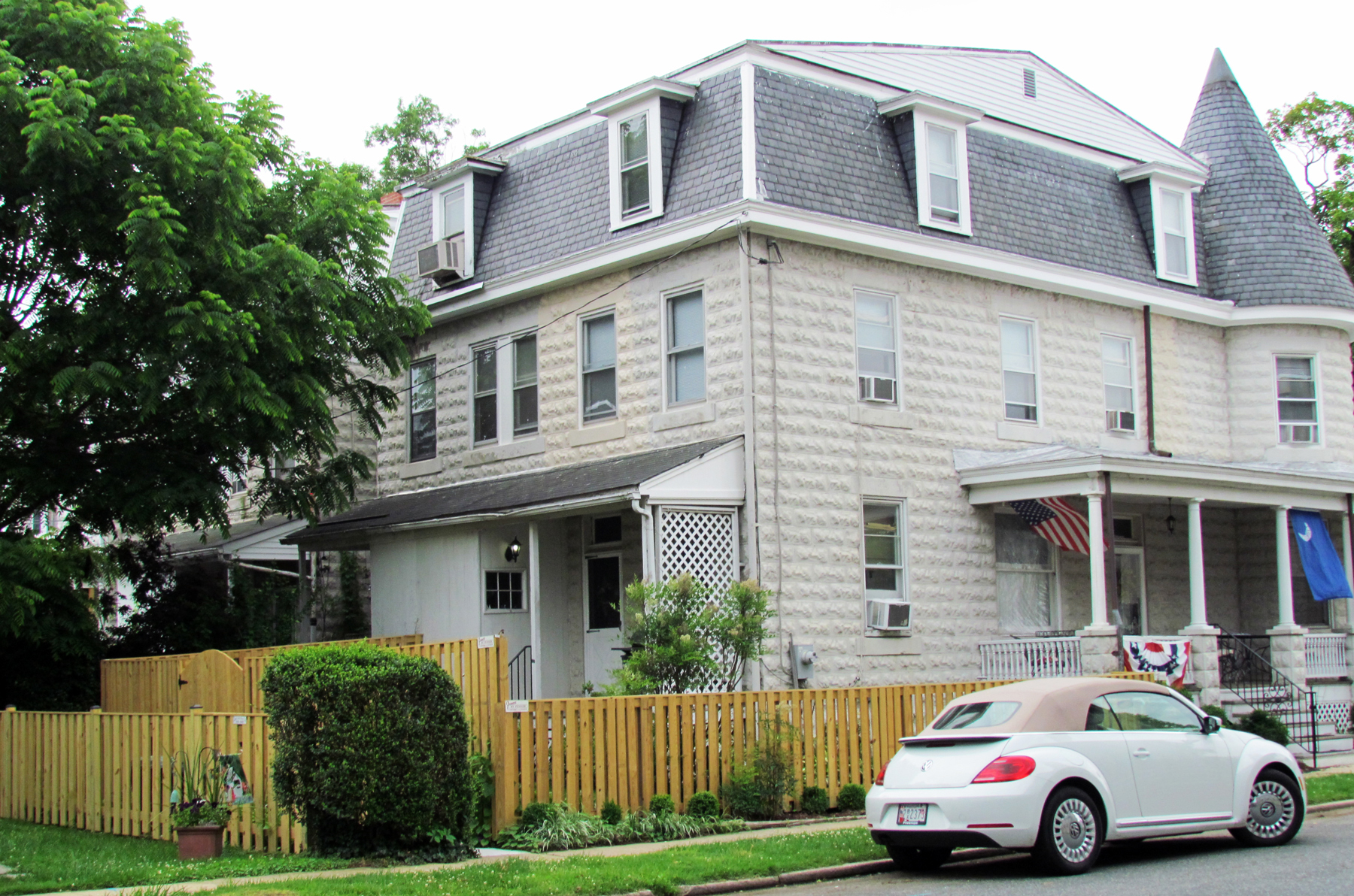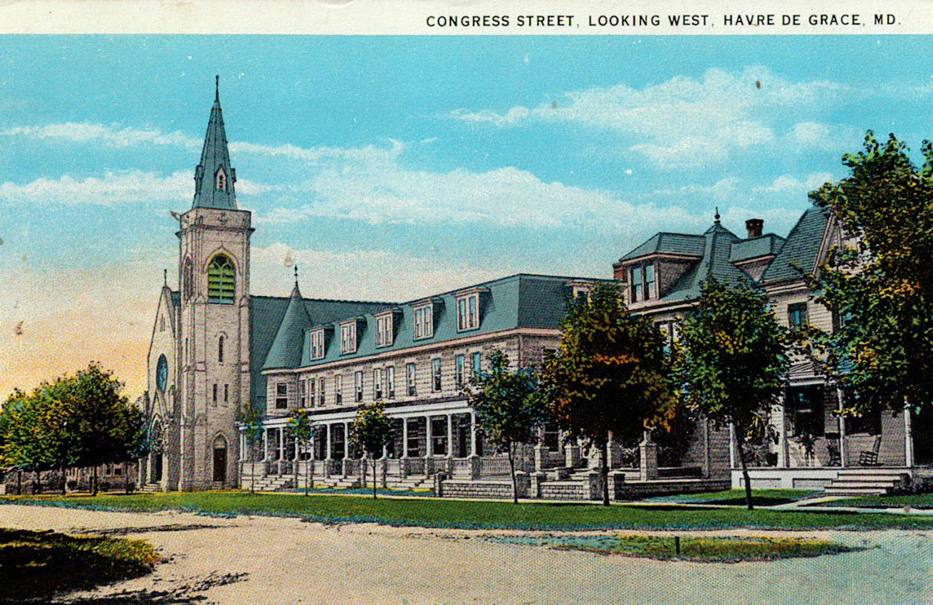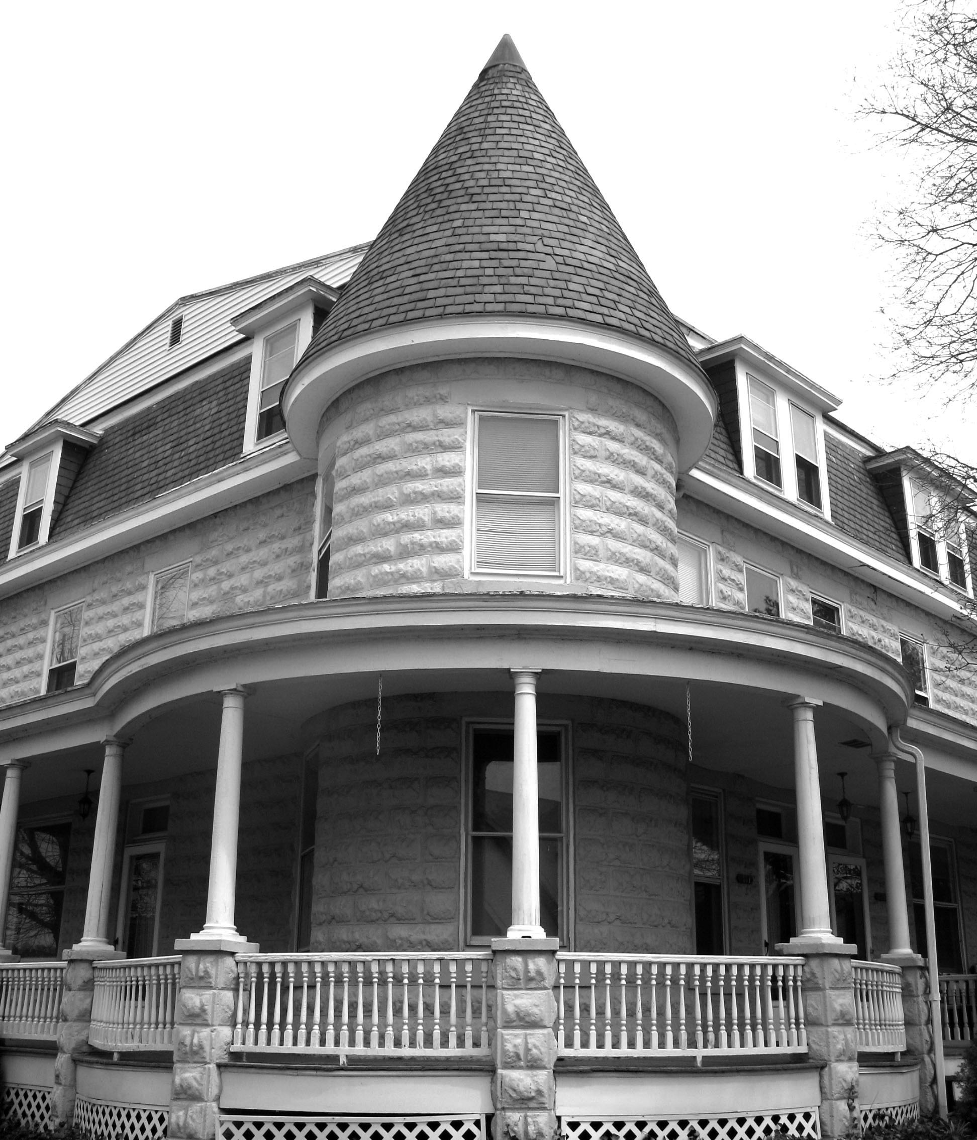 The buildings were framed using a method known as balloon framing, which means there are no interior bearing walls—all the bearing weight is on the exterior walls. The exterior is a distinctive textured concrete block manufactured in Havre de Grace. The plant that produced the blocks closed in 1913.