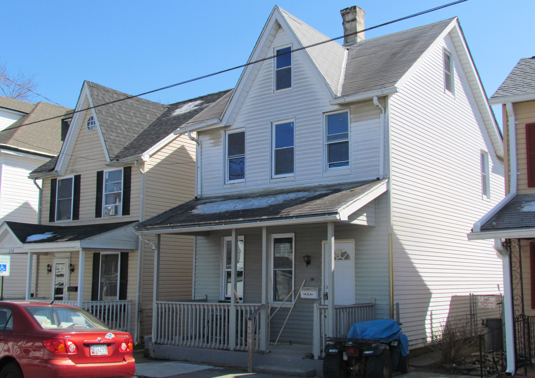 Having been owned for about a decade by Isaac and Elizabeth Hecht, who owned several properties in town, the Himes family bought the house in 1918 and various family members lived here until they sold it in 1957. The last Himes family members to live here were W. Robert Himes and his wife, Corinne. Robert served in the Navy in WWII and died in 1983. Helen E. and James Rodney Swam, Sr. were the next owners and raised their children here. Their daughter, Theresa (Terri) lived here with her mother until 2016, when Helen Swam died. The property was sold by Fannie Mae to Easy Wind LLC, who completely rehabbed the house including installing a new kitchen and bathrooms. The new owner in 2018 is Samuel Webb who is living in this home.