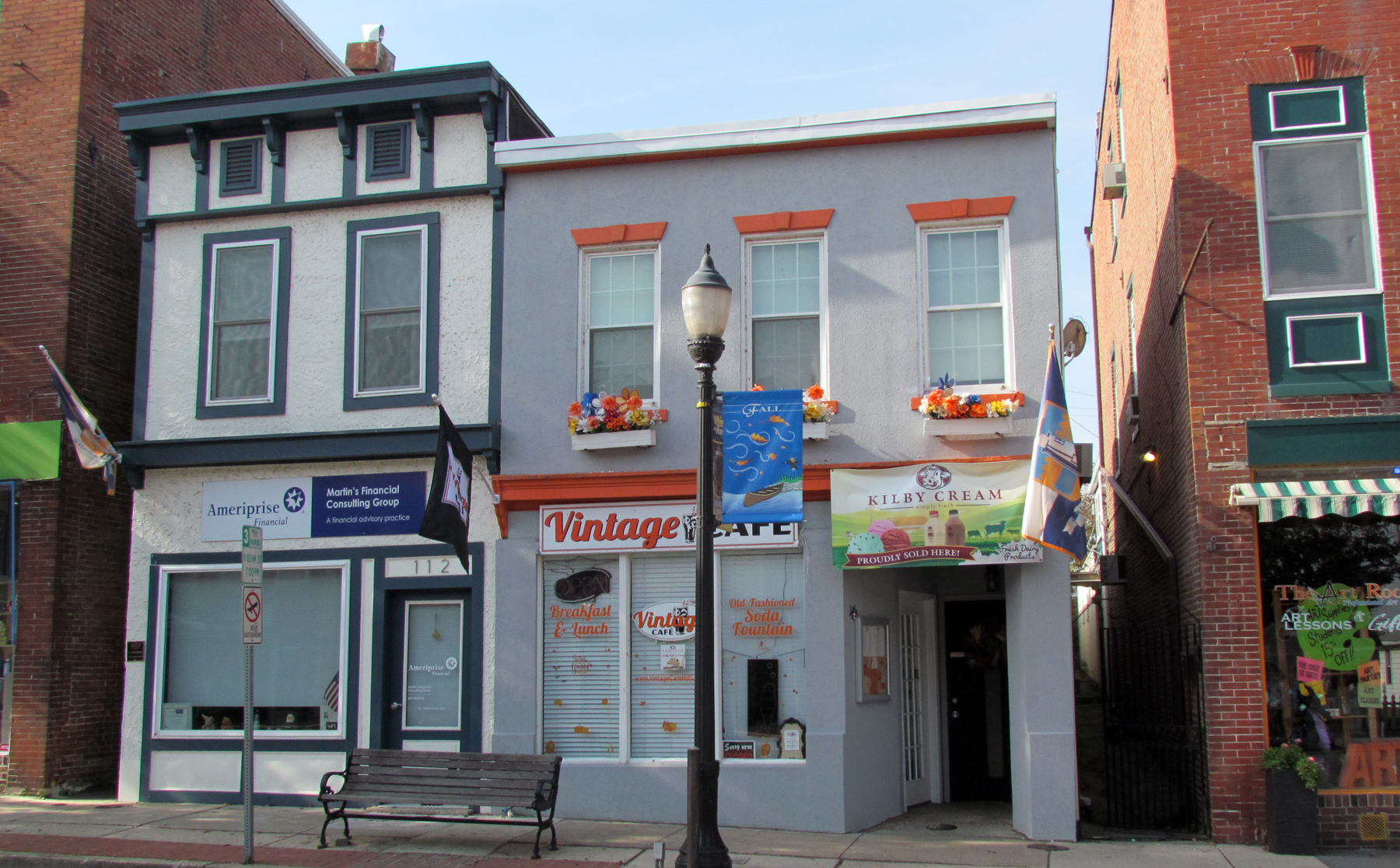 This property was completely renovated in 2014 as a restaurant by new owners, Laura Kalb and Jeannie Malott, who opened the Vintage Café as a breakfast and lunch restaurant in 2015. However, in February 2019, the Vintage Café business was bought by George Mullin, the owner of the former George’s Original Chicken across the street. His partner is Dana Rowley. The building is owned by 114 North Washington LLC.