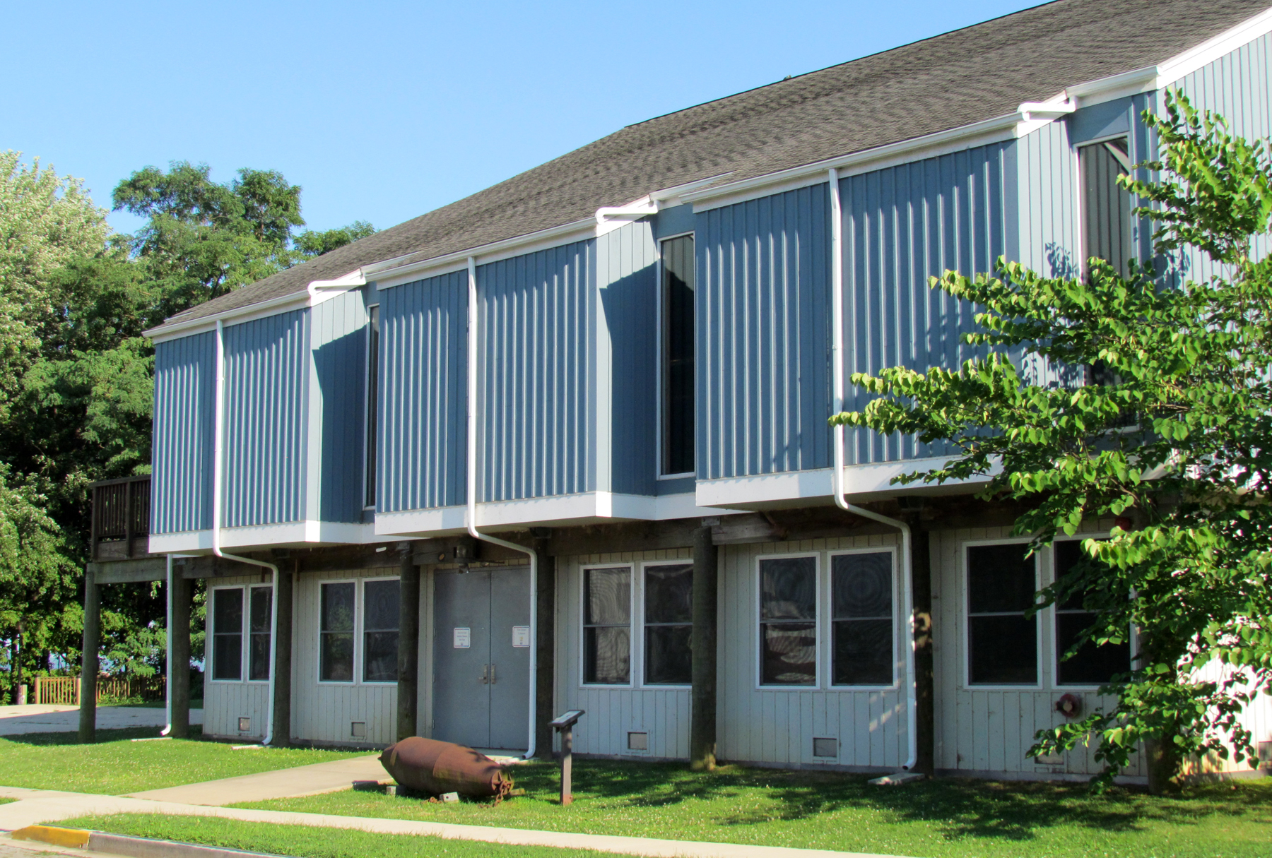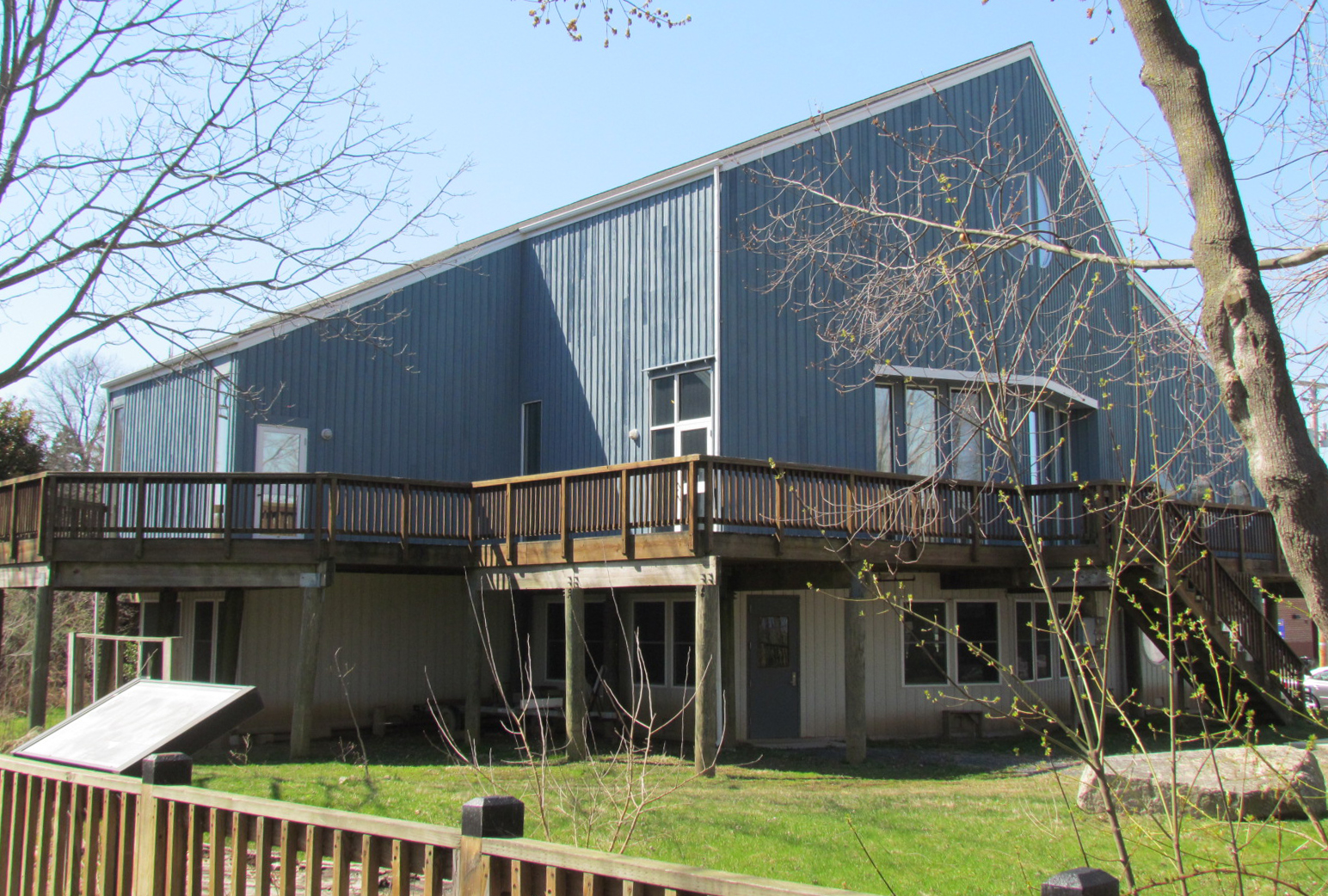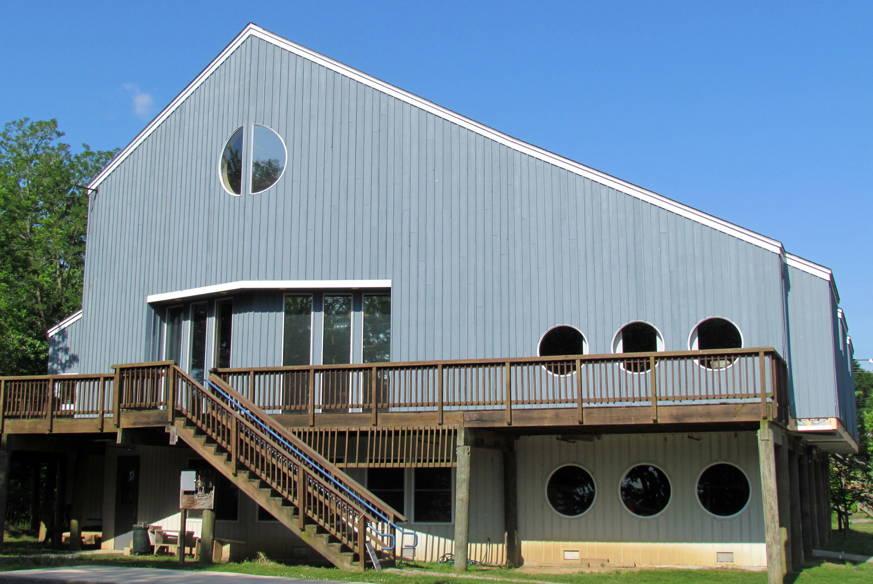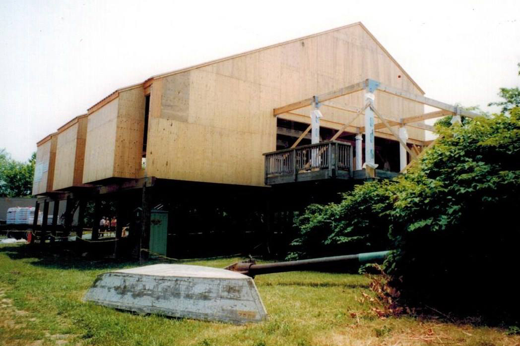 In 1991 a deck was built and in 1999 a 5,600 square-foot wood structure was erected over the former swamp land after the area was filled in and graded. Brass plates are engraved with names of donors of pilings and other parts of the building. There are many windows overlooking the water area including three made to look like large portholes.