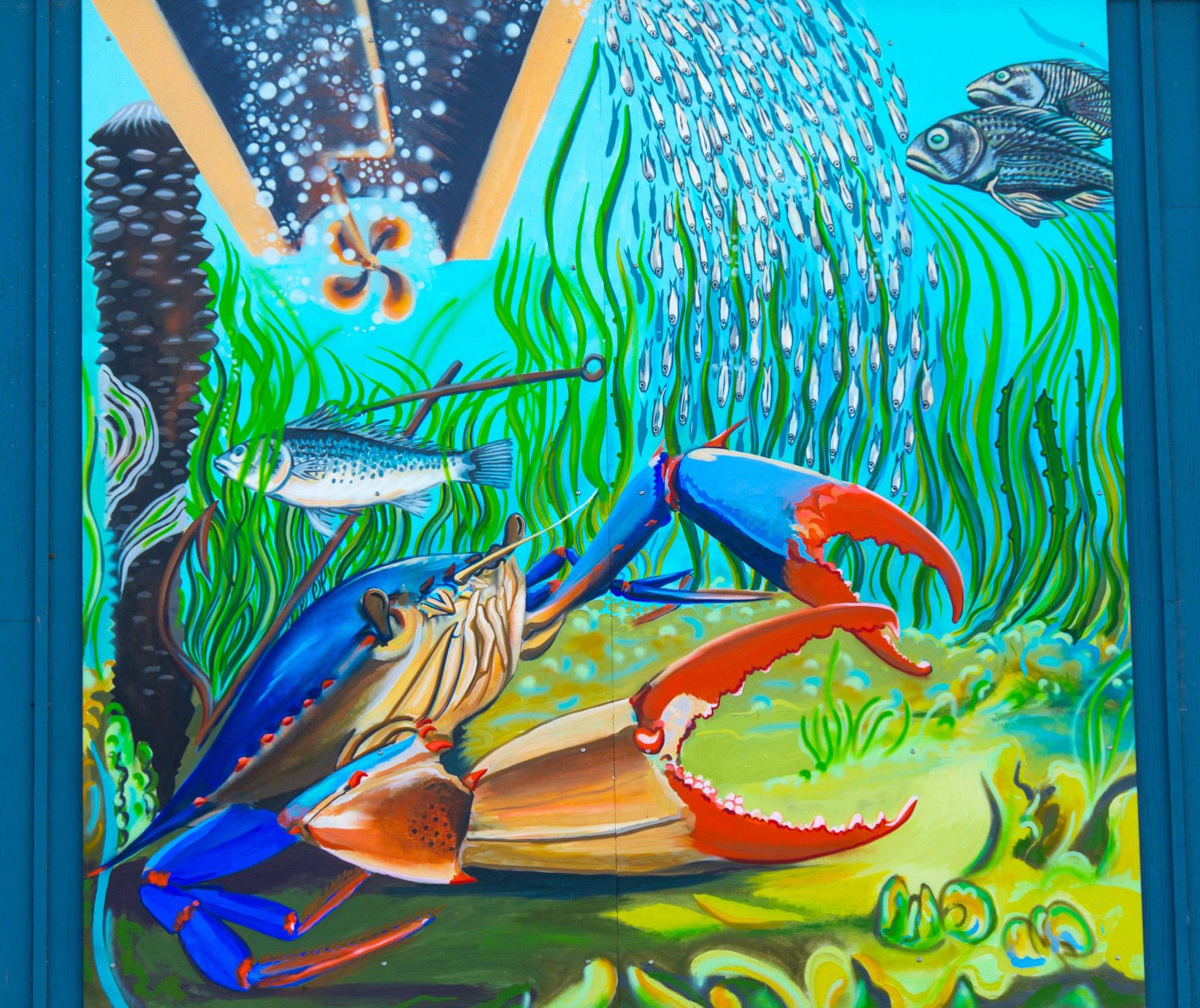The striking murals on the façade of the Museum facing Lafayette Street were created by internationally-recognized Philadelphia artist, Paul Santoleri in 2017. “Windward Trim” is a painting in three sections, showing ships, nautical instruments, and waterfront creatures. Paul Santoleri aims to convey buoyancy and movement with his art.