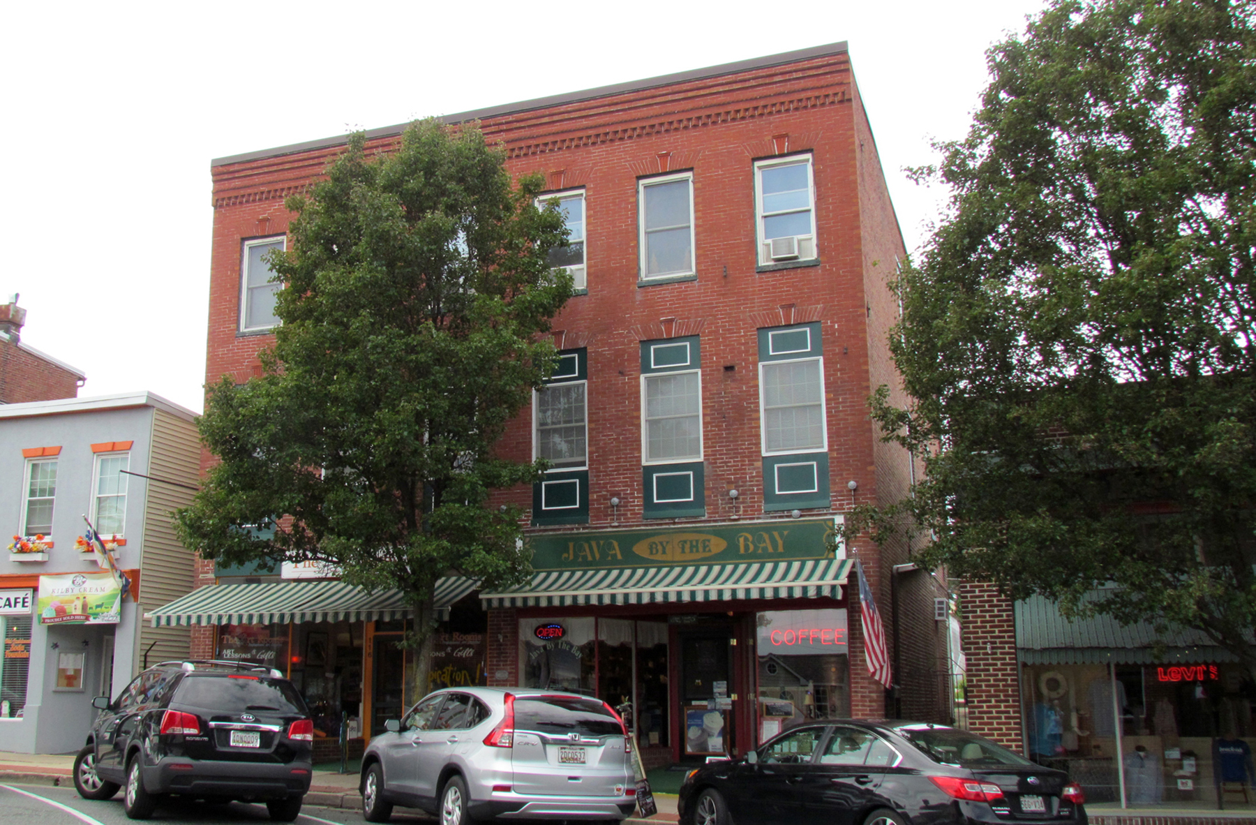 #118: In May 1993, this became the home of Java by the Bay, run by Ellen E. and Charles W. Glassman and Kathleen Michaels. With 30 varieties of coffee and Fortnum and Mason’s and Jackson’s teas, they had an espresso bar and also offered gift baskets. In May 2000, Charlie and Shalonn Lawson took over the business and continued to carry coffee and tea until they retired. Since November 2015, Java by the Bay has been operated here by Ron Anderson and Helen Granlund. The building is owned by three Silverstein brothers (of the Joseph’s Department Store family).
