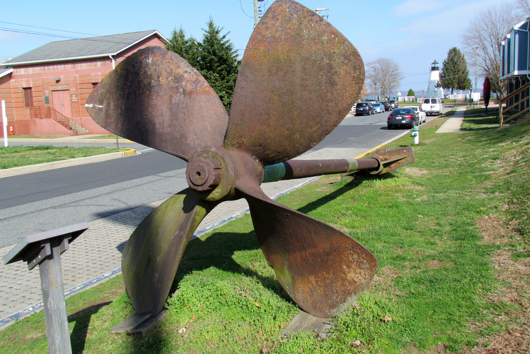 A propeller uses the principle of the screw to convert rotational motion into forward thrust to power a boat or ship in the water. This propeller was manufactured in 1895, and installed on the 135 foot tug Sea King. The tug reported for War 1917 at Havre de Grace to have its steam boiler replaced, but the war ended before work was completed. There, it was abandoned and sank. In 1953, George Pensell cleared the wreck to build the Tidewater Marina. He saved the propeller and shaft and later donated them to the museum."
