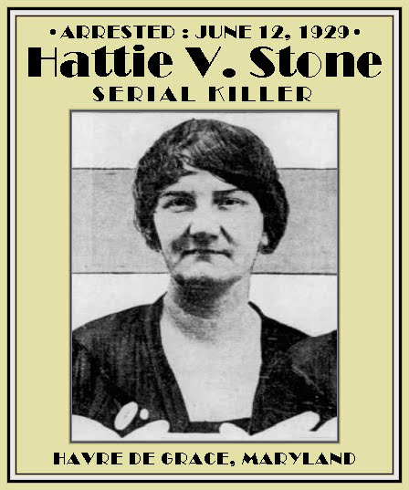 The murders came to light when Hattie Stone was arrested for poisoning her 15-year-old son, George, in 1929 for trust money he had received after the death of his father, Edward. During the course of the investigation and trial it was revealed that other family members had died under similar circumstances over the previous three years (from each of which Hattie collected insurance money). Mary “Emma” Johnston Stone (her mother-in-law) had died in January 1924; Hattie’s 18-year-old son, Edgar, died in June 1927; Edward A. Stone, her husband, died in January 1927; and George, her son, died June 1929. She was also suspected in the death of John H. Stone (1855-1919), her father-in-law.