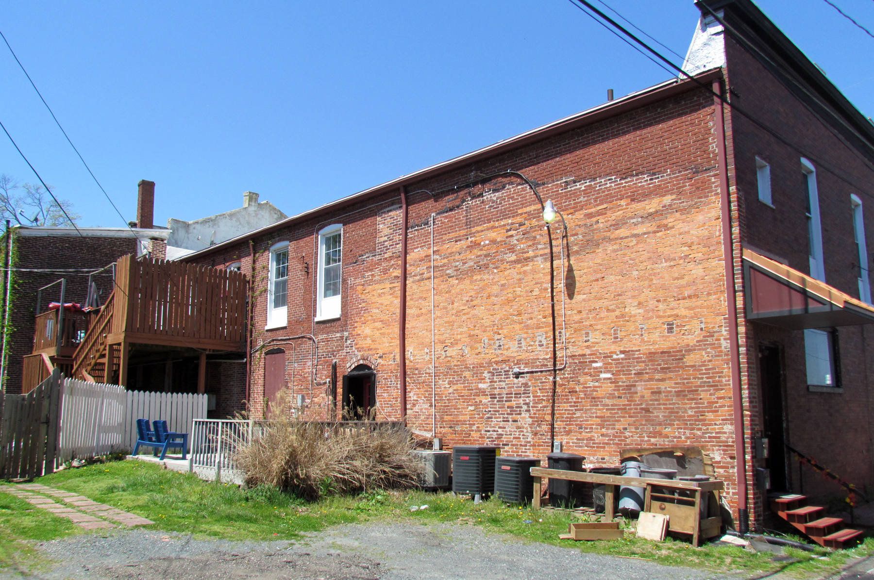 A large building on the south side of Franklin Street existed here during the latter half of the nineteenth century. It was The Riverview Hotel, with a swimming pool behind it on Lodge Lane, and opened by Lewis K. Herbst. He appears to have housed some U.S. troops here during the Civil War—Herbst is recorded as having petitioned the Committee on War Claims for compensation for damages sustained by the occupation of his property by United States troops. [Journal of the House of Representatives of the United States, Second Session of the 49th Congress, December 6, 1886.] The building is shown on the 1899 Sanborn Insurance Map.