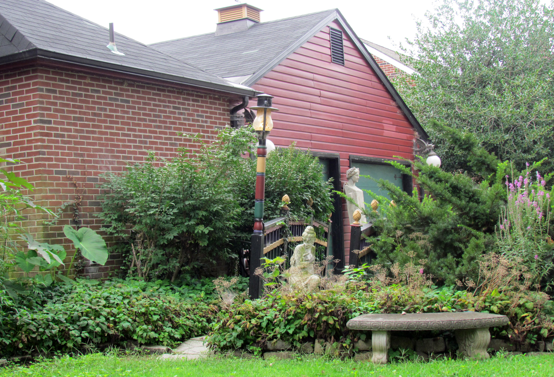 Tony Barcelone and Gene Unger opened their home to the 1985 Annual Candlelight Tour and loved to host elegant Christmas and 4th of July parties. The handsome formal dining room lay to the right from the entry. To the left was the parlor with its unusual domed recess, shades of gold in the embossed wallpaper and Chippendale sofa, and bisque and marble decorative pieces. Pastel stained-glass designs were in the door transoms as well as in a complete window at the end of a hall. Through the dining room was the newer part of the house with a modern kitchen and breakfast room with tangerine accents and skylights. They had added a sunny room overlooking a brick-walled “secret” garden entered through wrought iron gates. Rose-carpeted stairs led to the second floor where there were four bedrooms and a sitting room. The owners had used family possessions, paintings, ornate Strauss crystal chandeliers, and antique furniture to create a lavish décor.