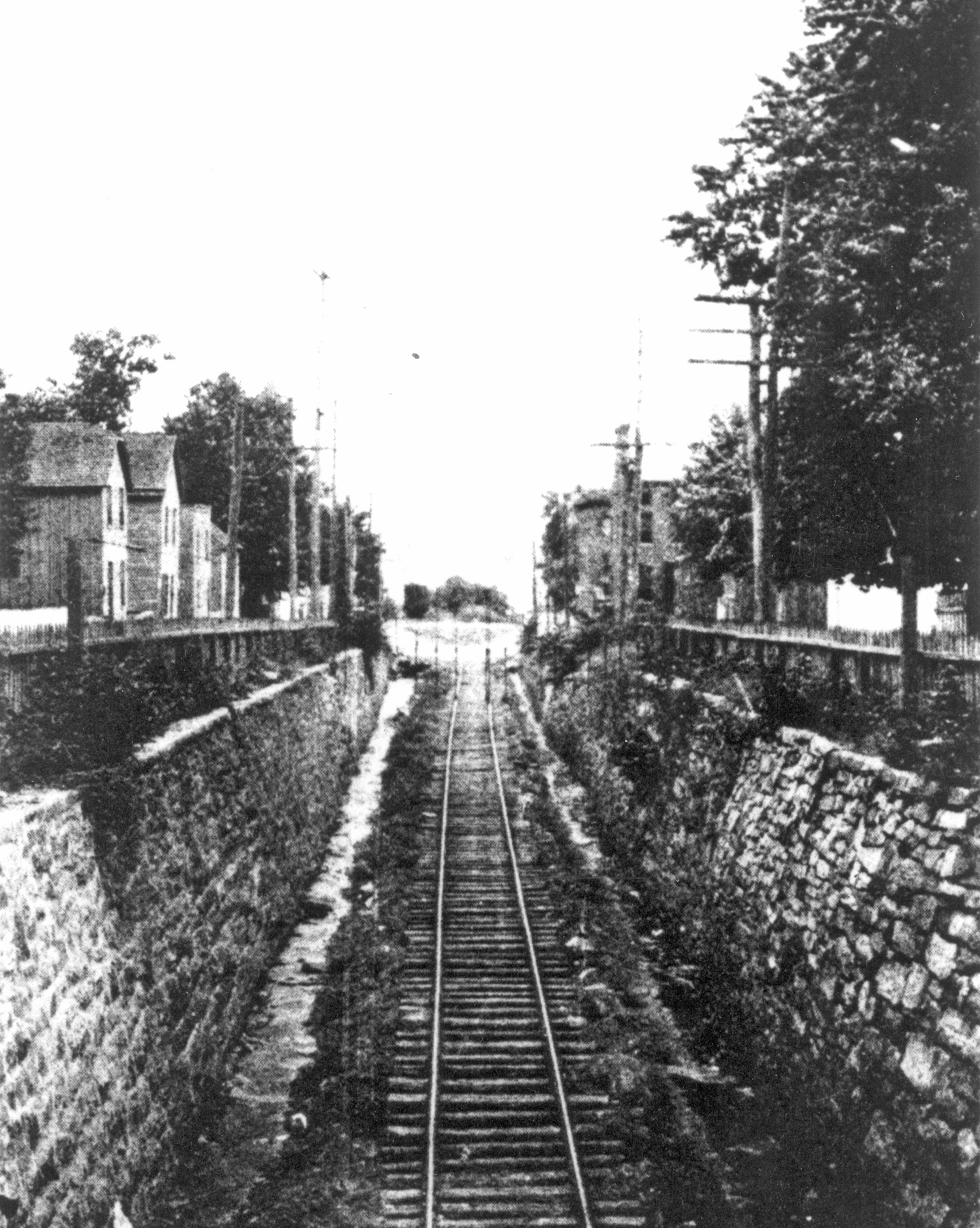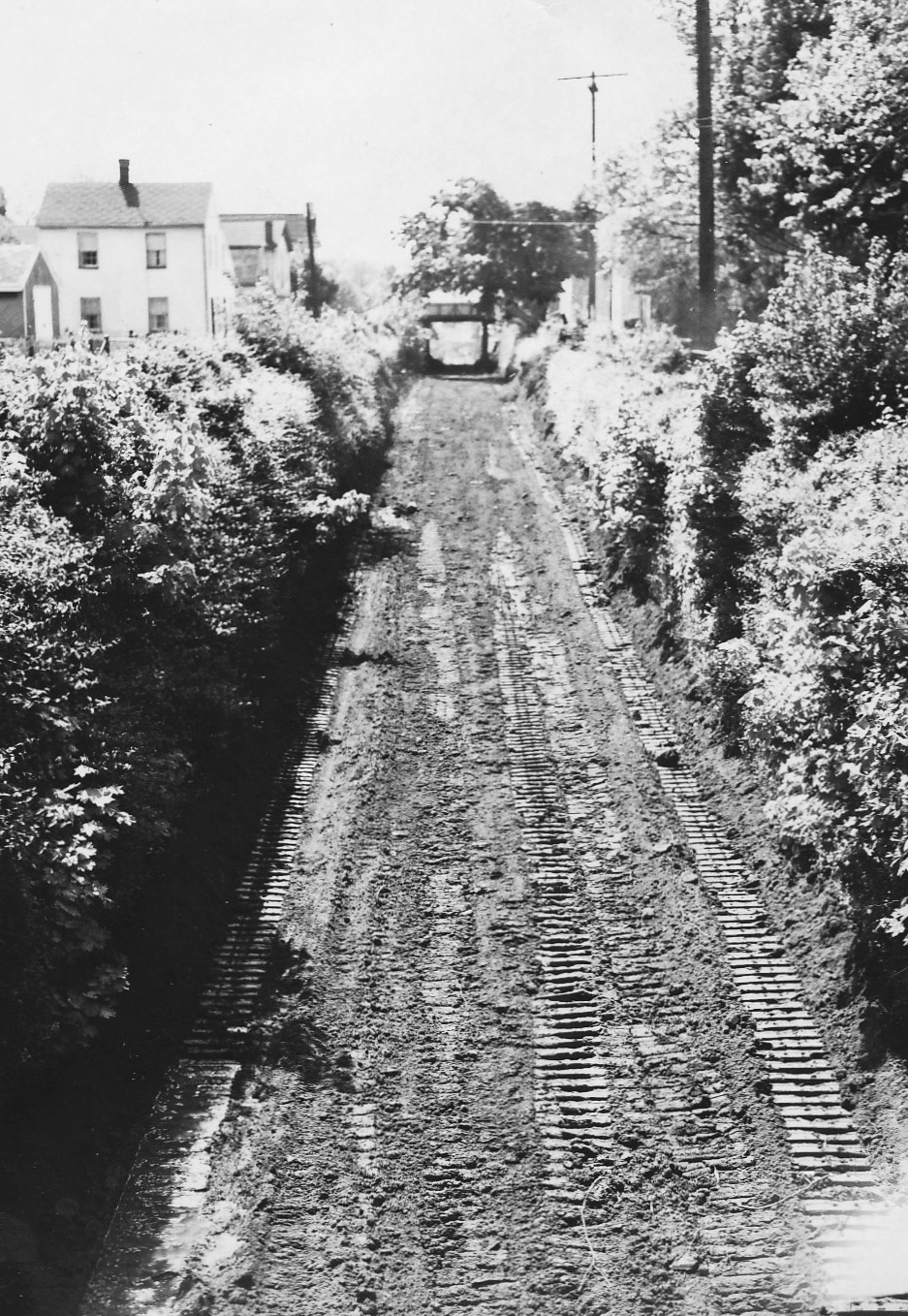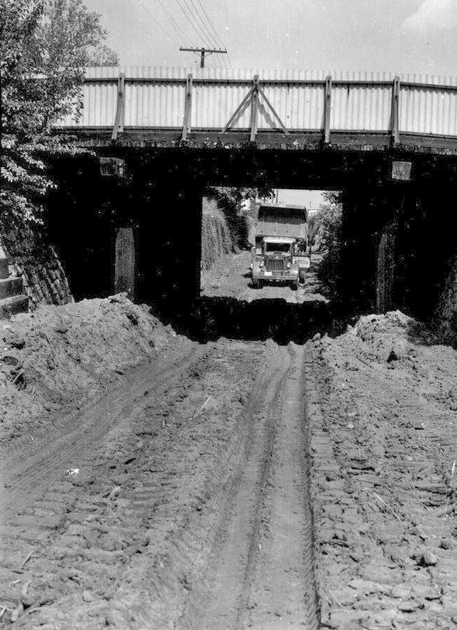 To get to the ferry a single track railroad was built from west of the city to the River to carry passengers and freight. “The Cut,” as it was called, was the section of the railroad spur that ran west to east along St. Clair Street from 1836 beneath retaining walls and dropping below wooden bridges on Stokes Street, Washington Street, and Union Avenue. The Cut allowed trains to travel from west of the city from 1836 to the water. The Cut was filled in during 1958 (because the trains had stopped running) with dirt that came from the Hebditch property on the north side of US Route 40 at Lewis Lane. It took 2,700 truckloads by 20-ton dump trucks to fill in The Cut. Once The Cut was filled in, bridges were removed and the streets were leveled and paved.