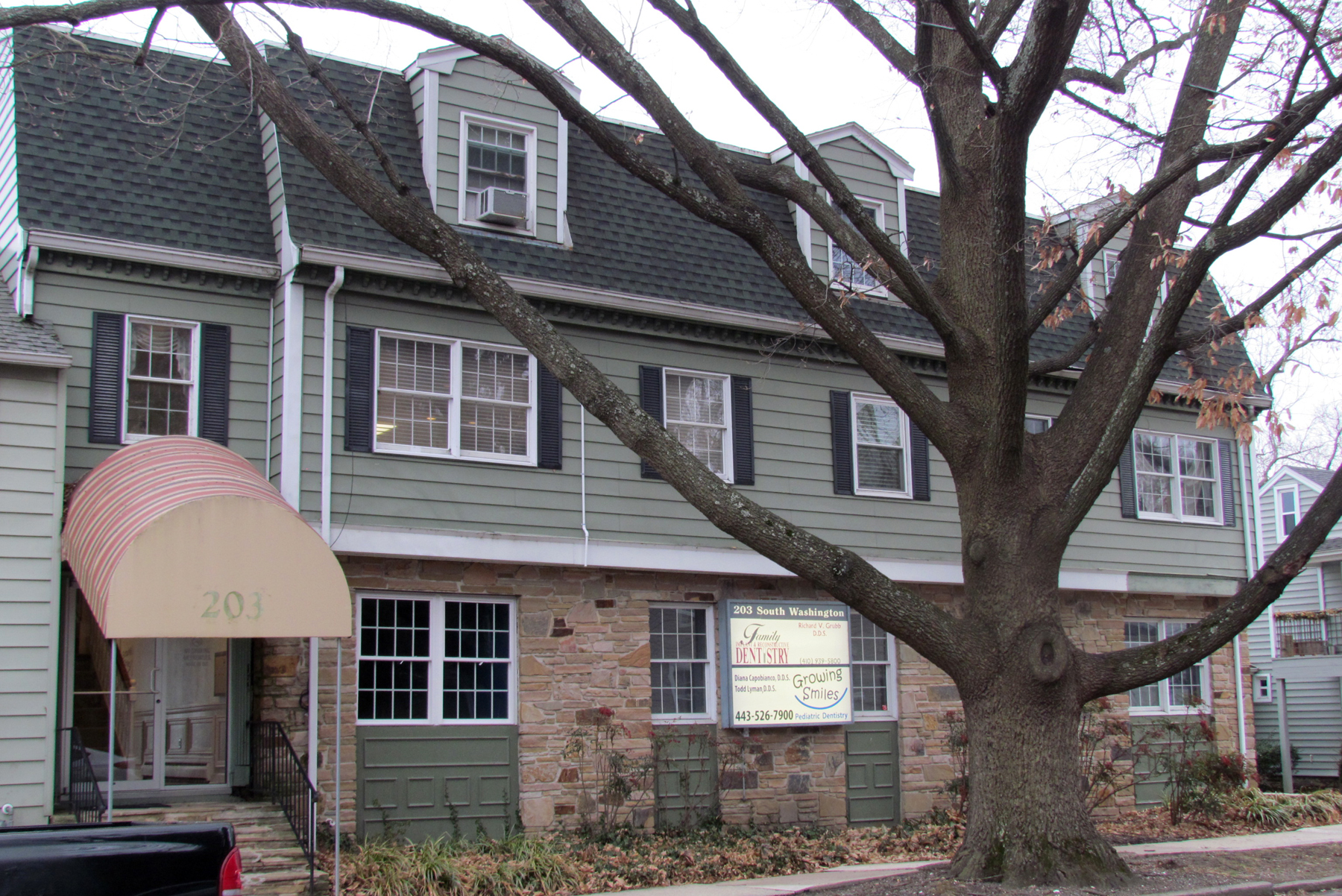 In 1973 the Maslins sold the corner property to Dr. Salvatore Vozzella and his wife, Patricia. The Vozzellas also acquired the third lot that was owned by Christopher Rosemer since 1954. It is believed that the Vozzellas created a dental practice here until Salvatore’s death in 1983. The following year, Patricia Vozzella created a partnership with Dr. Richard V. Grubb and his wife, Brigitte Grubb, and deeded the property to the three of them. This large medical building includes the original #201 building on the corner as well as the new building that they constructed in 1984 at #203 South Washington Street.