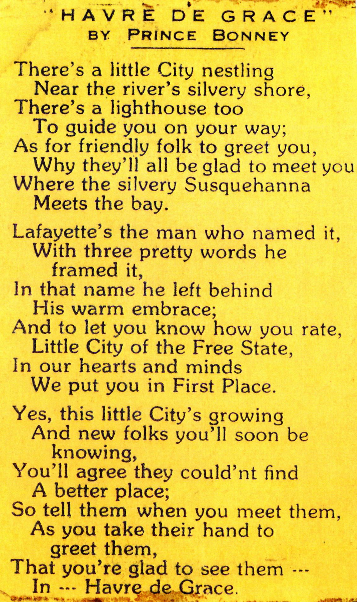 In 1922, Charles “Prince” Bonney (1891-1975), having served in the Army in WWI, purchased the home and lived here with his mother (Nellie Starr Bonney), his nephew (Maurice Harold Bonney, Jr.), and his niece (Emily Bonney). Prince Bonney, as Charles liked to be known, lived in this house for the remainder of his life, a span of more than 50 years. He may at times have invested in real estate because, in 1945, Louis and Myra Good sold the large Parker Mitchell House (a rooming house) at 518-520 Franklin Street to Prince Bonney. He held that until 1952 when he sold it. Other than that, Prince Bonney was a poet who loved Havre de Grace—he wrote a poem to show his love. Prince Bonney’s brother, Maurice “Harold” Bonney, Sr. lived at 316 South Washington Street with his wife, Anna, from 1939 to 1971, and served on the City Council in the 1950s.