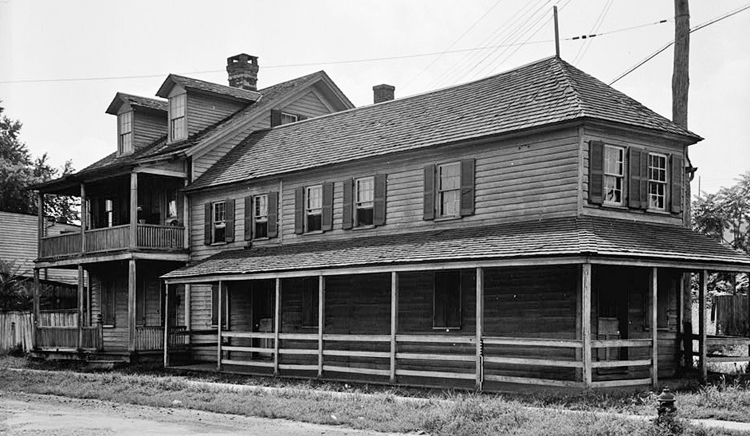 This triangular property was formerly owned by Joshua Green (1761-1840) who lived nearby. It was near the shipyards, particularly MacGowans’ at the old ferry dock of the railroad. A building here was formerly used by Lyttleton Green (1817-1897 and Joshua’s son) as a Ship Chandlery Shop. In the distribution of Joshua Green’s estate in 1874, this property went to Elizabeth Green Frieze (Joshua’s daughter) who was married to Colonel J. Thompson Frieze (1826-1898). Some people who knew this building describe it as having a “log cabin” in the middle of it and suggest that the building was constructed around the cabin.