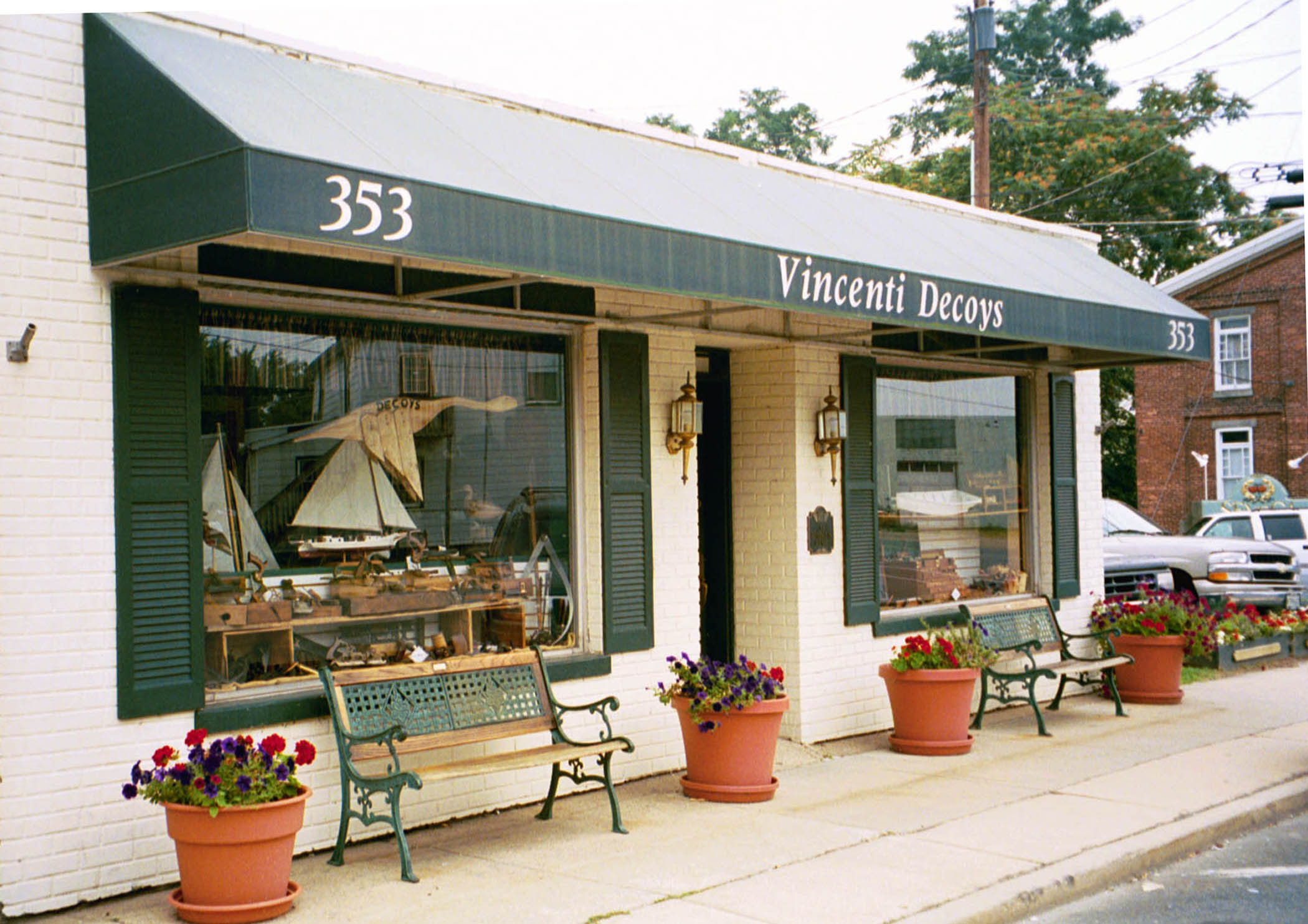 Pat and Jeannie Vincenti first opened their decoy and gift store, Vincenti Decoys, at this address in 1994 (which is within Amanda’s parcel of land). Vincenti’s continues to flourish today with many hand carved and painted decoys and other Chesapeake Bay decor. They also carry supplies for the carver, including paint, brushes, and tools. Jeannie, the daughter of Rex and Ida Bishop of Havre de Grace, had met Pat while working for Gary Williams at the “Big Cone” in Havre de Grace in the 1970s. Pat was then working in the Bel Air Bakery for his late Uncle, Jim Hamilton, while honing his skills at decoy carving.