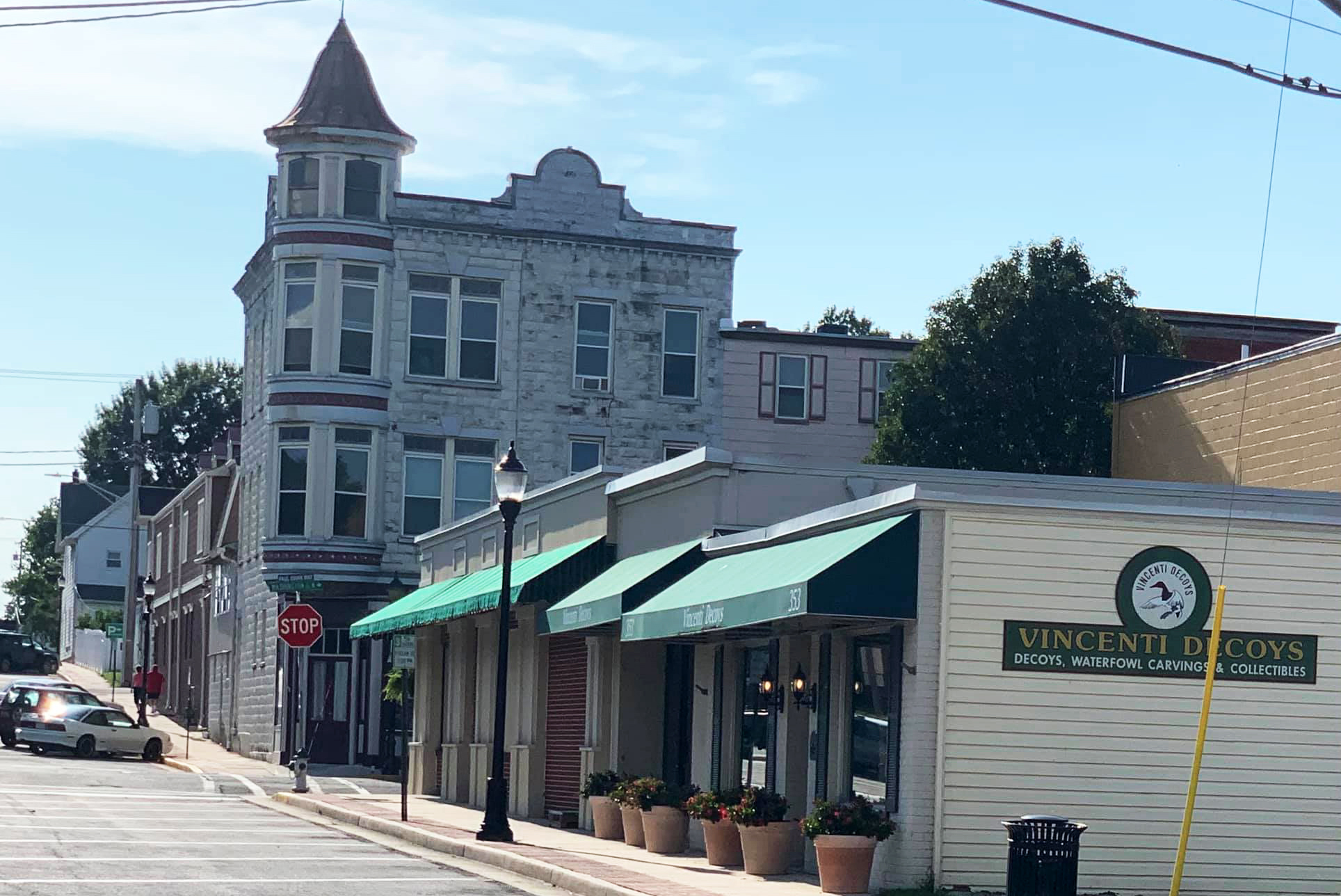 Vincenti Decoys is located on a parcel of land previously owned at different times by Aloysius “Loach” and Dorothy Hergenrother, Emanuel and Fannie Hecht, and Jacob E. and Gladys Hecht. By 1949 the original buildings (including the old “White Chapel” on North Washington Street) were sold to Jacob Hecht and Hannah Hecht (his sister), who demolished them. In their place, in 1953 they built the new stores that we see today at the corner of Pennington Avenue and North Washington Street. The Hechts owned the new property for about 30 years before selling it to Arthur H. and Ann C. Helton. In 1988, the Heltons sold the property to Amanda DiDomenico, who continues to own it, which includes Amanda’s Florist & Gifts at 201-203 North Washington Street.