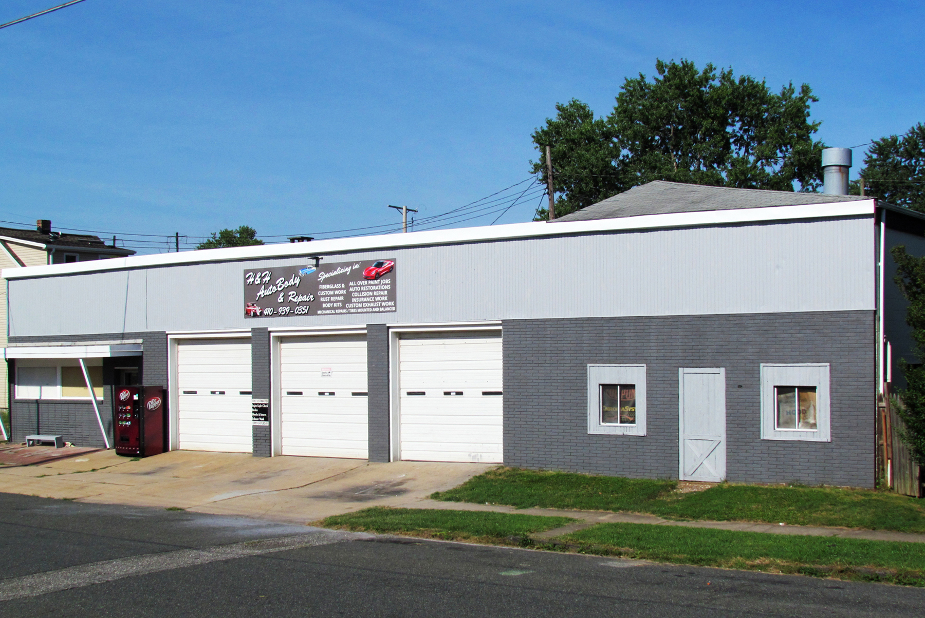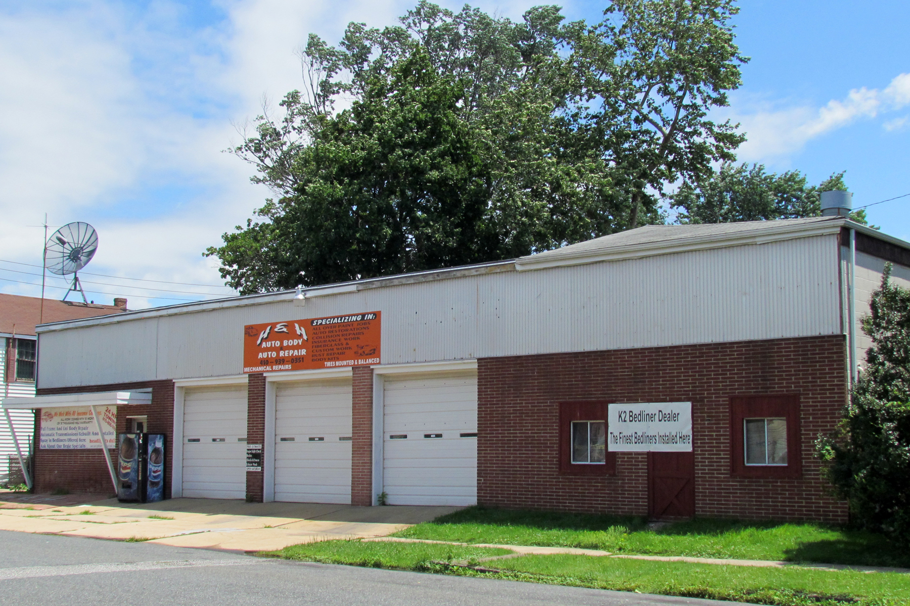 In 1970, the Loebleins sold this property to Tawney’s Garage, Inc., of which John T. Barrow, Jr., was President. They advertised as “Tawney’s Garage, Harford and Cecil Counties’ Leading Wreck Rebuilders,” and it had its own fleet of tow trucks. In 1996, Tawney’s Garage, Inc. sold the property to Kenneth and Patricia Kiddy who relocated to Florida in 2003 and sold it to Allen J. Fair, a local real estate investor. Pete and Richard Properties LLC (with Peter Tebin and Richard Forton) were owners from 2006 to 2011, when they sold it to Mark A. Hensley and Brian K. Hensley, who opened their new business, H&H Auto Body here.