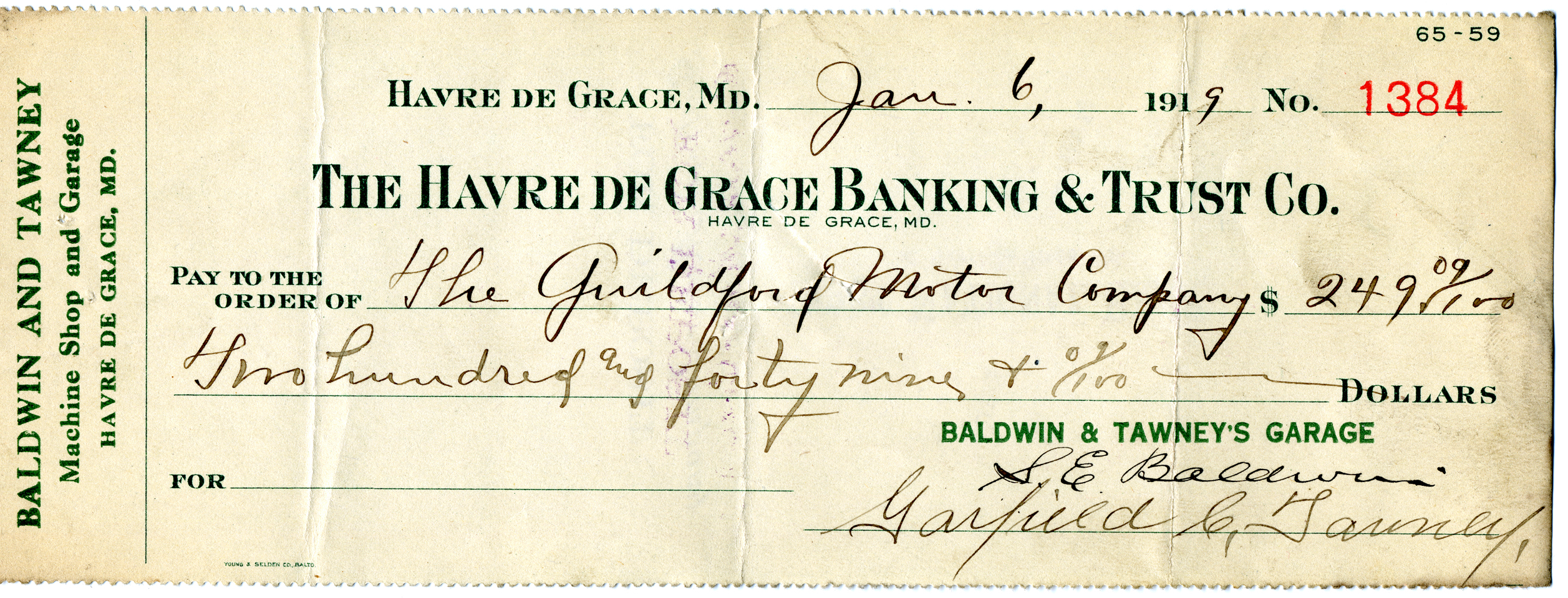 By 1911, Isaac Hecht had sold the hotel business (but not the property) and following his 1913 death the no-longer flourishing hotel also no longer needed the ice house or livery. The Hecht family leased this property to “Baldwin and Tawney’s Machine Shop and Garage.” Baldwin was Samuel Edward Baldwin who married Clara M. Godwin in May 1919 and Tawney was Garfield C. Tawney (1881-1946) whose wife was Lulu Wells Tawney. Records show that they were doing business and had telephone service here in 1916 (the current owner found a ledger and bookkeeping records dating back to 1916). And this building with its name is shown on the 1921 Sanborn Insurance Map. That map also shows the small buildings directly east of the rear of the shop that opened to Centennial Lane (on the 1910 Sanborn Map they were marked as “Hecht Hotel Livery” and “Ice House”). William Pyle recalls that when he worked at Hecht’s Hardware store on North Washington Street as a kid, Jake Hecht stored the tote boards from the “White Chapel” pool hall “in a shed behind Tawney’s Garage.” Those buildings are now part of this business.