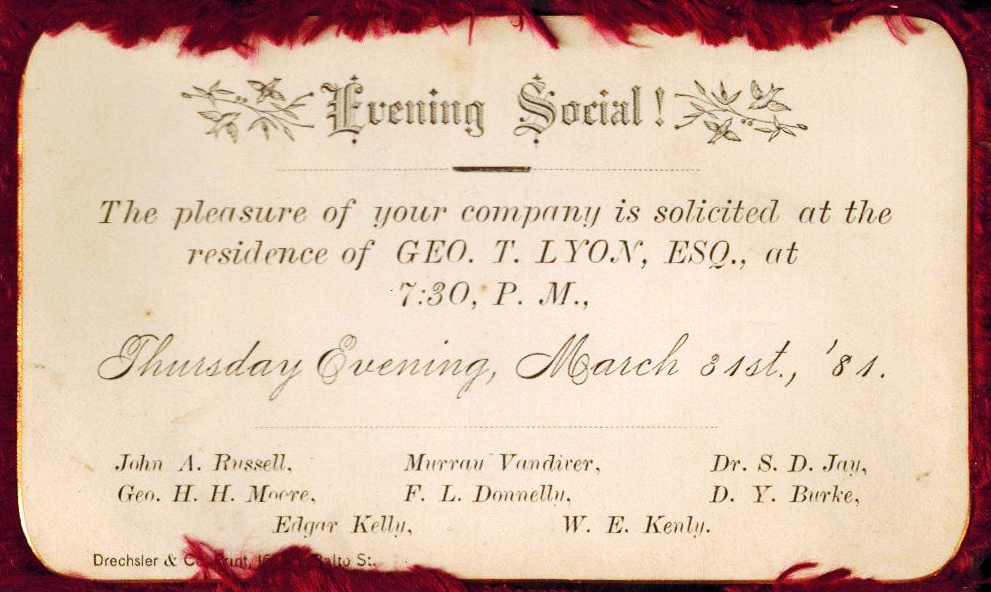 described as “the biggest social event of the season,” and “in the home on Union Avenue of ex-Councilman George T. Lyon” on March 31, 1881. The party began in the “mansion” and then “adjourned to City Hall.” All the prominent social and business people of the city were invited on a specially printed invitation.
