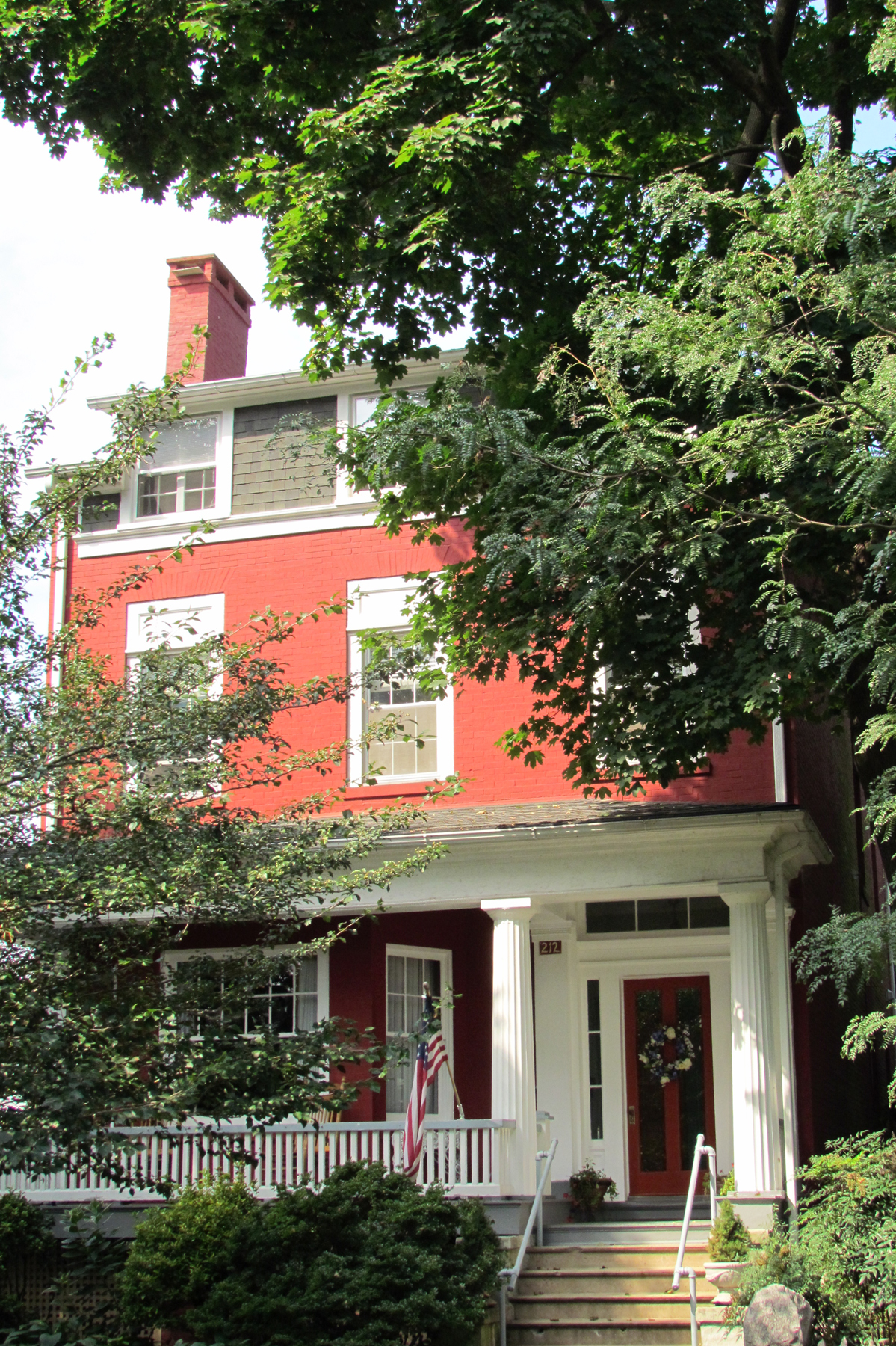 This is referred to as one of the “Canal Houses” because of their origin dating back to 1840 when the Susquehanna & Tidewater Canal opened and expectations were high for the future material prosperity of the city. This is one of the three brick Greek revival houses built in this block around the same time—including The Hoke House (213 South Union Avenue) and The Hall House (227 South Union Avenue). The front facade has a one-story, two-bay Doric portico with a balustrade and slightly hipped roof. An intricate frieze on the fascia can be seen above the porch. A distinguishing feature of the Sappington House is its fully raised lighted basement, lined in brick, with a large cooking fireplace, and windows. These basements were originally built for servants.