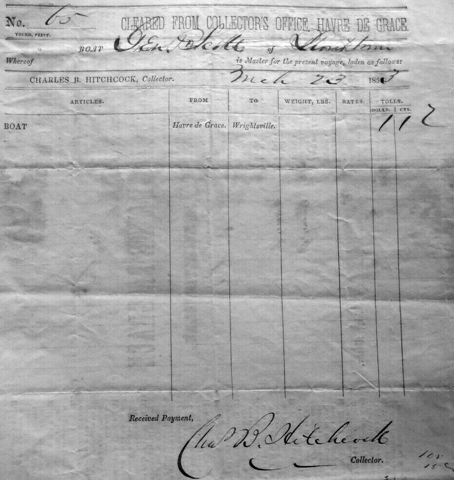 The canal comprised 29 locks, serving as a stairway of water elevators that allowed the mule-drawn canal boats (often weighing as much as 60 tons and more) to move up and down the 44 miles and 231 feet of elevation to Wrightsville, Pennsylvania. Although there was a certain type of design to the canal boats there also was variation depending on their use. They had to be strong enough to carry their freight down to Havre de Grace but after being unloaded many were dismantled, the wood sold, and the owner and crew sometimes had to walk back to Pennsylvania. There were regulations governing the boats—among them was that they had to have their names painted on the stern or other conspicuous place; the owner had to report in writing to the collector’s office what he was hauling, and its weight, so that the correct toll could be calculated; each boat had to sound a horn within a quarter mile of any lock intended to be passed; and the owner had to state if there were passengers and where they were going.