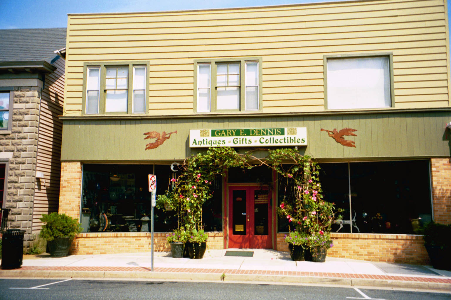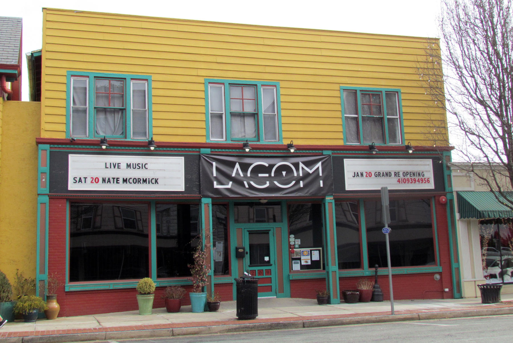 Michael Boyd and his late wife, Alice, owned this building for a couple of years beginning in 1978 and ran “Mike’s Home Supply Center” on the first floor. From 1981 to 2006, the building was owned by Art and Ann Helton with Gary E. Dennis Antiques on the first floor. In 2006 the building was purchased by Bruce and Sherifa Clarke who created the Laurrapin Grill and Laurrapin Catering. They joined this building to their property at 209-211 North Washington Street. In January 2017 the Clarkes sold the Laurrapin Grill restaurant business to two of their employees, Christina Sciarra, Executive Chef, and Janice Rogers, General Manager, while Bruce continued to operate Laurrapin Catering. The new owners named their restaurant, Lagom, meaning “to be happy with just enough” love and spices. To the surprise of a lot of customers, Lagom closed its doors in May 2019.