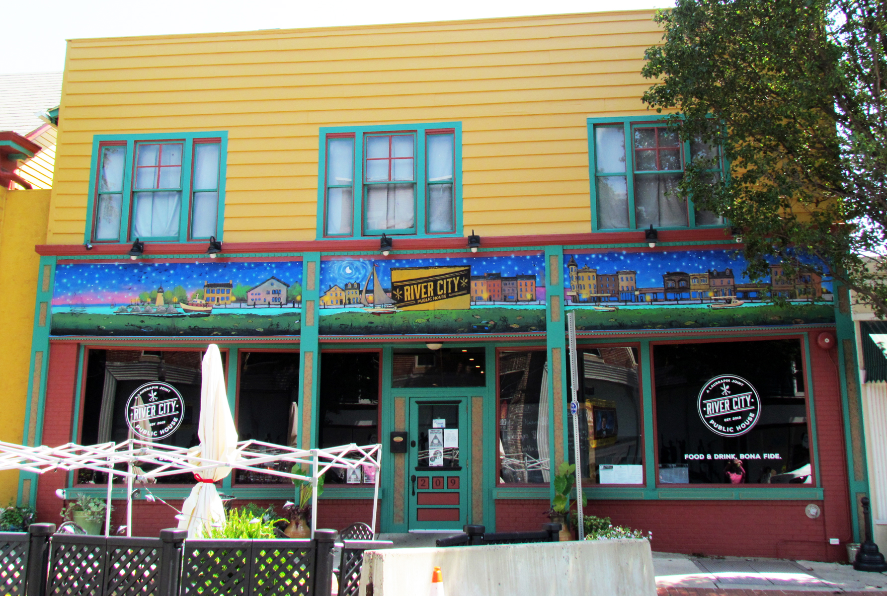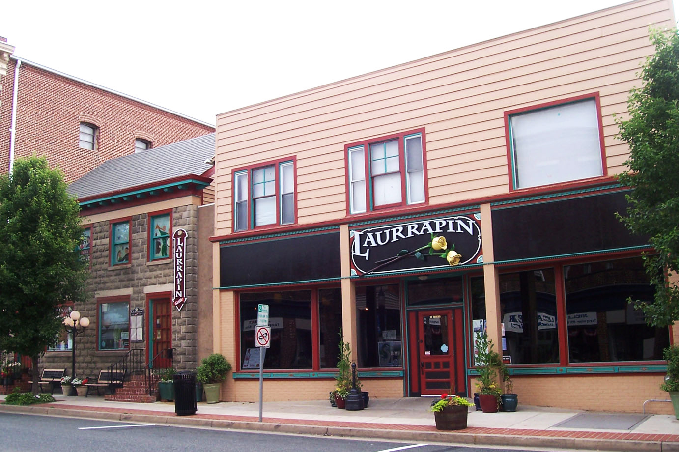 The Clarks continue to own the two buildings, now connected, and Bruce opened the River City Public House here in spring 2020 while continuing to run Laurrapin Catering. See 209 North Union Avenue for a discussion of that building.
