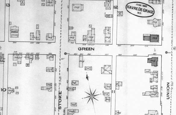 This property was part of the several lots deeded “with natural love and affection” and Two Thousand Dollars in 1879 by William R. Young (1826-1909) of Harford County “but sojourning for a while at Knoxville, Tennessee,” to Esther Young, his wife. William was well known in the city, having served as Bailiff from 1866 to 1872. Also included in the 1879 deed were William Young’s rights to the fish packing house and ice house on the town wharf near the old railroad depot and landing, “with all fixtures and appurtenances belonging thereto.” This home appears on the Sanborn Insurance Map of June 1885 (the first published) and most likely was built by William and Esther Young before he began his 1879 “sojourn.”