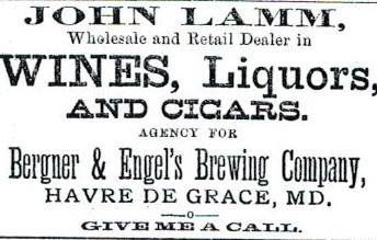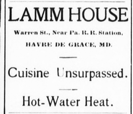 John Lamm (1820-1882) and Caroline Weaver Lamm (1825-1892) of Port Deposit bought this property in 1881 and built what became known as a hotel and tavern called the Lamm House. It ran 78 feet west on the south side of Warren Street from Freedom Alley. When John died the following year, the hotel was taken over by one of his two sons, Charles A. Lamm (1862-1905). Charles married Mary Eldora “Mollie” Phillips (1868-1945) in 1891 at Mollie’s home in Philadelphia and they both then ran the hotel in the 1890s. The Clerk of the Court issued a liquor license in 1894 to Charles, along with a couple of other establishments. Charles and Mollie had two girls: Esther Lamm (1894-1977) who later married William Melvin (1870-1946); the other was Lena Lamm Moore (1892-1969) who married Leo M. Moore, Sr. (1880-1946), publisher of The Democratic Ledger