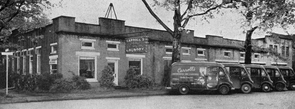 Established by T. Milton Carroll, Sr. (1880-1945) in 1903, Carroll’s Steam Laundry opened on Stokes Street with one horse-drawn delivery wagon and a handful of employees. In 1910, he built an office here at Franklin and Adams Streets and other departments were added over the years, including dry cleaning, fur storage, and rug cleaning. By 1953, Carroll’s brick plant took up a full block bordered by Adams, Franklin and Warren Streets, had a fleet of nine one-ton trucks, a staff of 100 employees, and their office here.