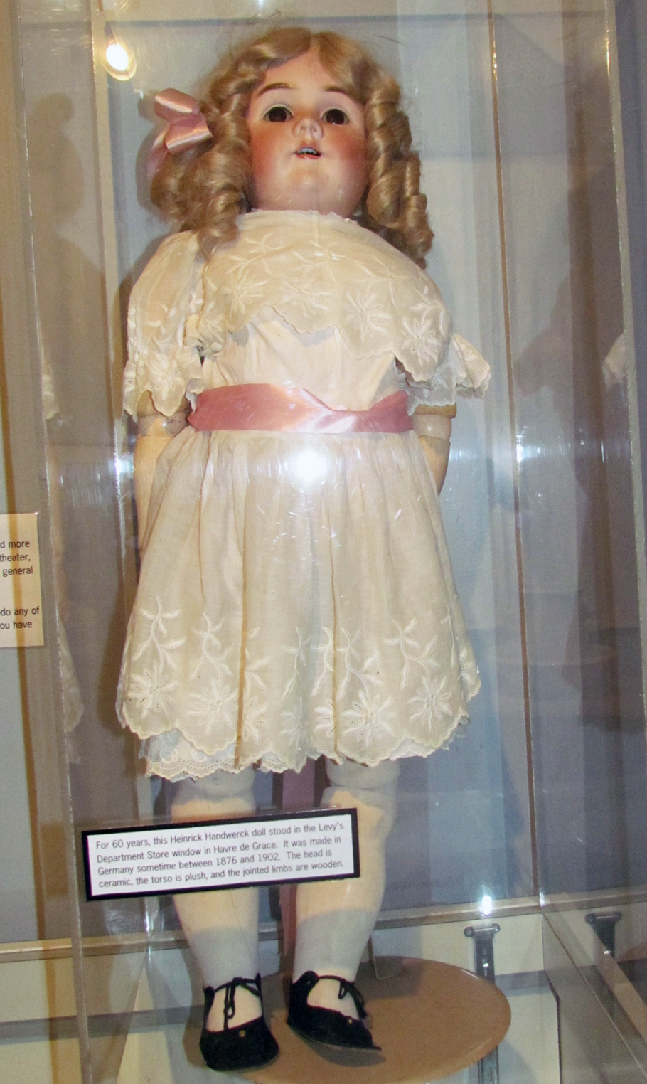 For 60 years, a Heinrich Handwerck doll stood in Levy’s Department Store window here. Known as some of the most beautiful dolls in the world they were made in Germany by Heinrich Handwerck and his wife, Minna, between 1876 and 1902, when Heinrich died. The head was ceramic, the torso plush, and the jointed limbs were wooden. That doll is now housed in the Susquehanna Museum of the Lockhouse.