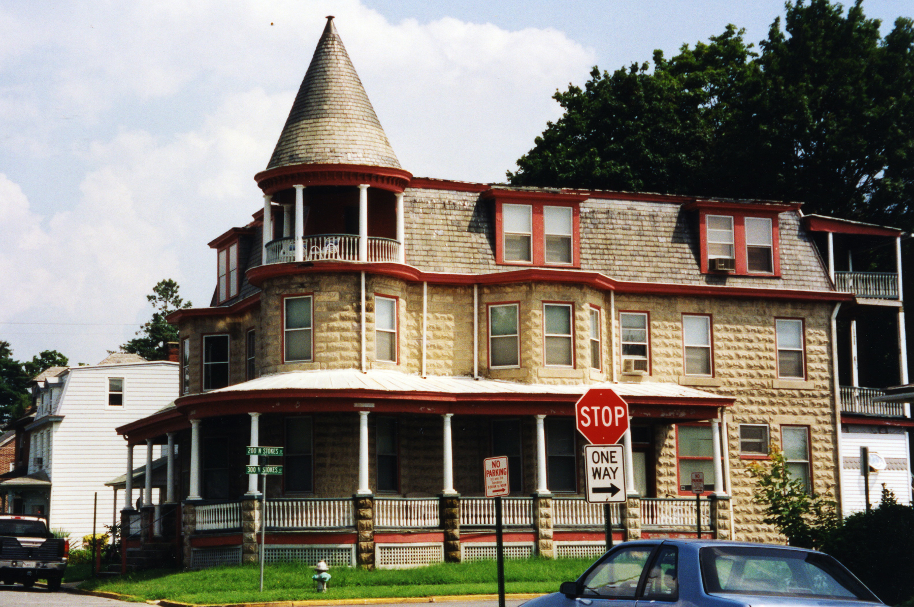 The land on which this formstone mansion was later built on the southeast corner of Green and Stokes Streets was sold by Bailiff William R. Young (1826-1909) in 1866 to Esther Young, his wife (pursuant to an Act of the General Assembly of Maryland the commissioners were authorized to direct the bailiff to sell certain lots). After Esther’s 1906 death, an ownership dispute arose that was resolved by court trustees selling this parcel of land to Reese “Norris” Burns (1870-1946) in 1909. Norris was one of the five well-known Burns brothers who had been operating the Burns Carriage Factory at 666 Green Street and had built several houses (including the 700 block of Green Street and the 500 block of Congress Avenue) during the previous decade.