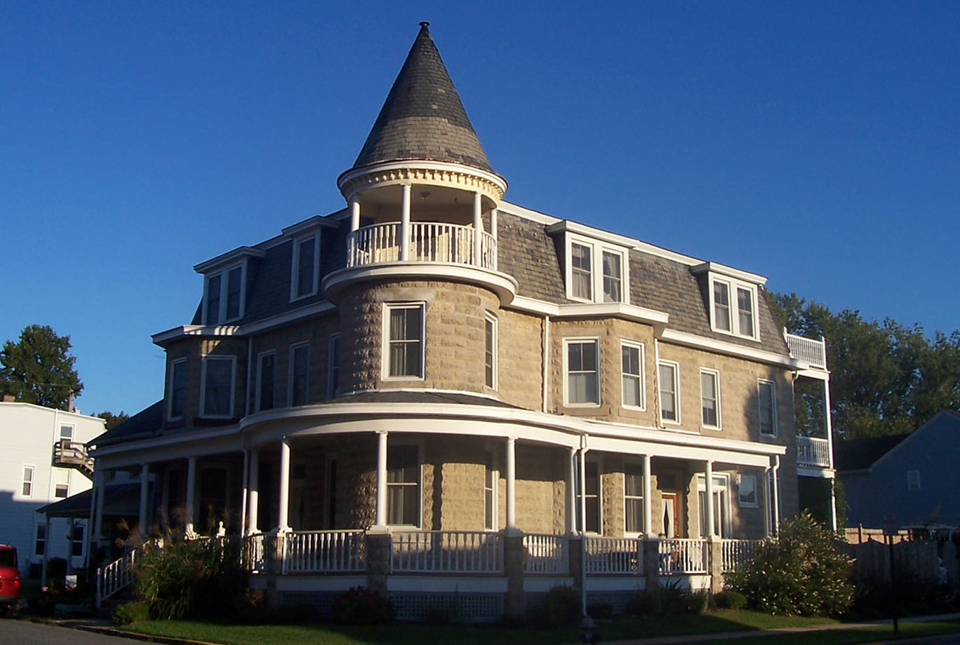 Norris Burns and his wife, Edith Baekey Burns, built this large textured concrete block exterior mansion with a turret and rear balconies in 1909 the same formstone style of others the Burns brothers had built in the city. The building is shown on the 1910 Sanborn Insurance Map. This home, spanning two lots, was for their personal use; and they had telephone service here by 1916. Norris Burns operated a real estate and insurance business in the 1930s and 1940s at 311-315 St. John Street in the former Riverton Building. After Norris’s sudden 1946 death (while waiting in his office for an appointment) his widow, Edith, continued to live here until she died in 1954. Following Edith’s death an ownership dispute arose between Charles Burns and Clinton Baekey causing the court to order trustees to sell the property in 1954 to Murray B. Lawder (1918-1993) and his wife, Virginia. The Lawders are a prominent Havre de Grace family with both real estate and business holdings, and Robert T. Lawder served as Mayor from 1939 to 1951.