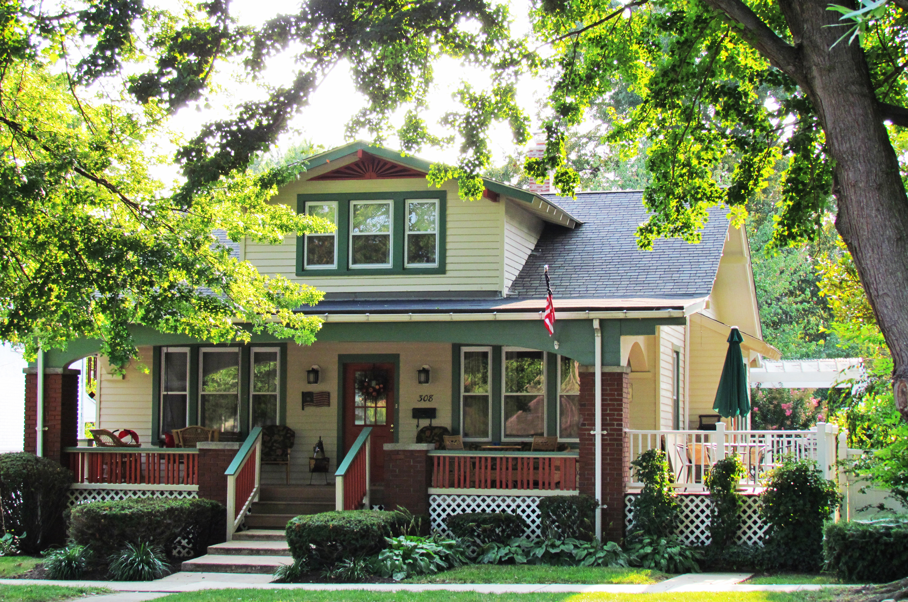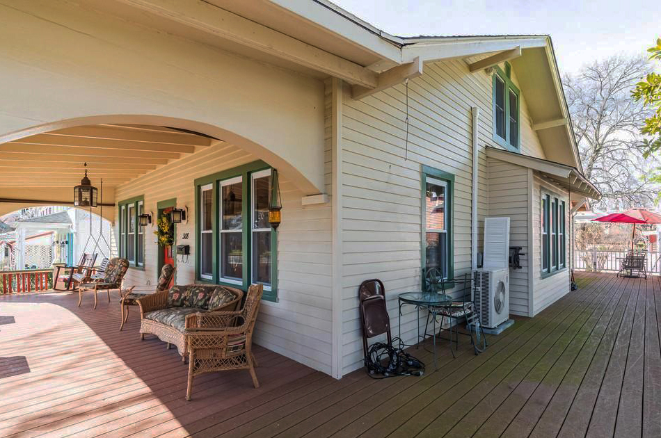 Some modifications that have been made to this home are obvious from photographs, the most obvious being that the steps to the porch and front door are now centered on the house. And a pergola and deck have been added in the rear of the house.