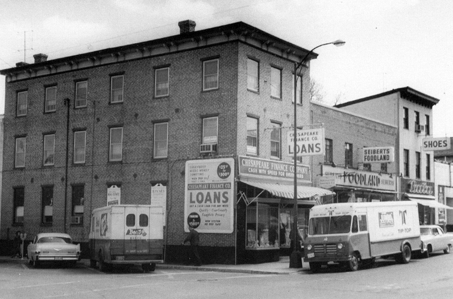 This first floor used to be Chesapeake Finance, which offered “Cash with speed for every need,” in the 1940s, followed by Midland Finance Company. In 1955, this was the location of Z. Witt, Jeweler, for whom Stanley M. Keen and Evelyn Murray worked at different times. Z. Witt moved his jewelry store a few years later to the Masonic Building at 213 North Washington Street.