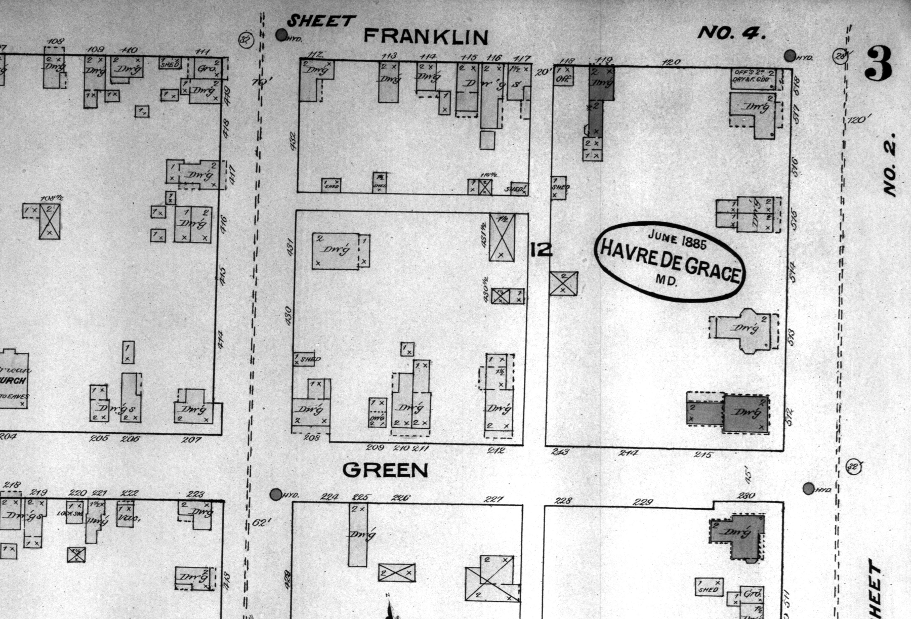 This property on the southeast corner of Franklin and North Stokes Streets was owned by George H. Bristow (1828-1896) and his German-born wife, Margaret Schreitz Bristow, when Margaret died in 1904. The house appears on the Sanborn Fire Insurance Map of 1885 and had been either built by or acquired by the Bristow family. Upon their mother’s death, the adult children conveyed the Bristow estate to Trustee Peter Lesley Hopper (1856-1917) to divide it among them. This corner property and a lot immediately south of it was deeded in 1904 to Jackson Wickes Maslin (1862-1943) and his wife, Katherine “Kate” Maslin (1863-1918), a daughter of the Bristows. Kate had married Jackson Maslin in 1898; her other siblings were Pearl, Charles, Harvey, and Fannie Bristow.